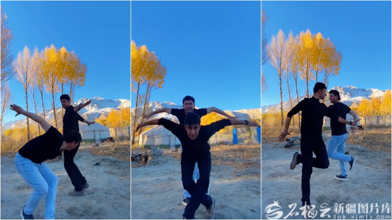 阿里甫夏·木巴日克卡旦木和邻居为王勇展示塔吉克族鹰舞。视频截图