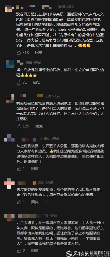 11月初,王勇将这次经历制作成短视频《本地人》,视频一经发布,便引发了广大网友的共鸣:“塔吉克族是值得尊重的民族,他们一生守护着祖国的边境”“塔吉克族就是帕米尔的雄鹰”……