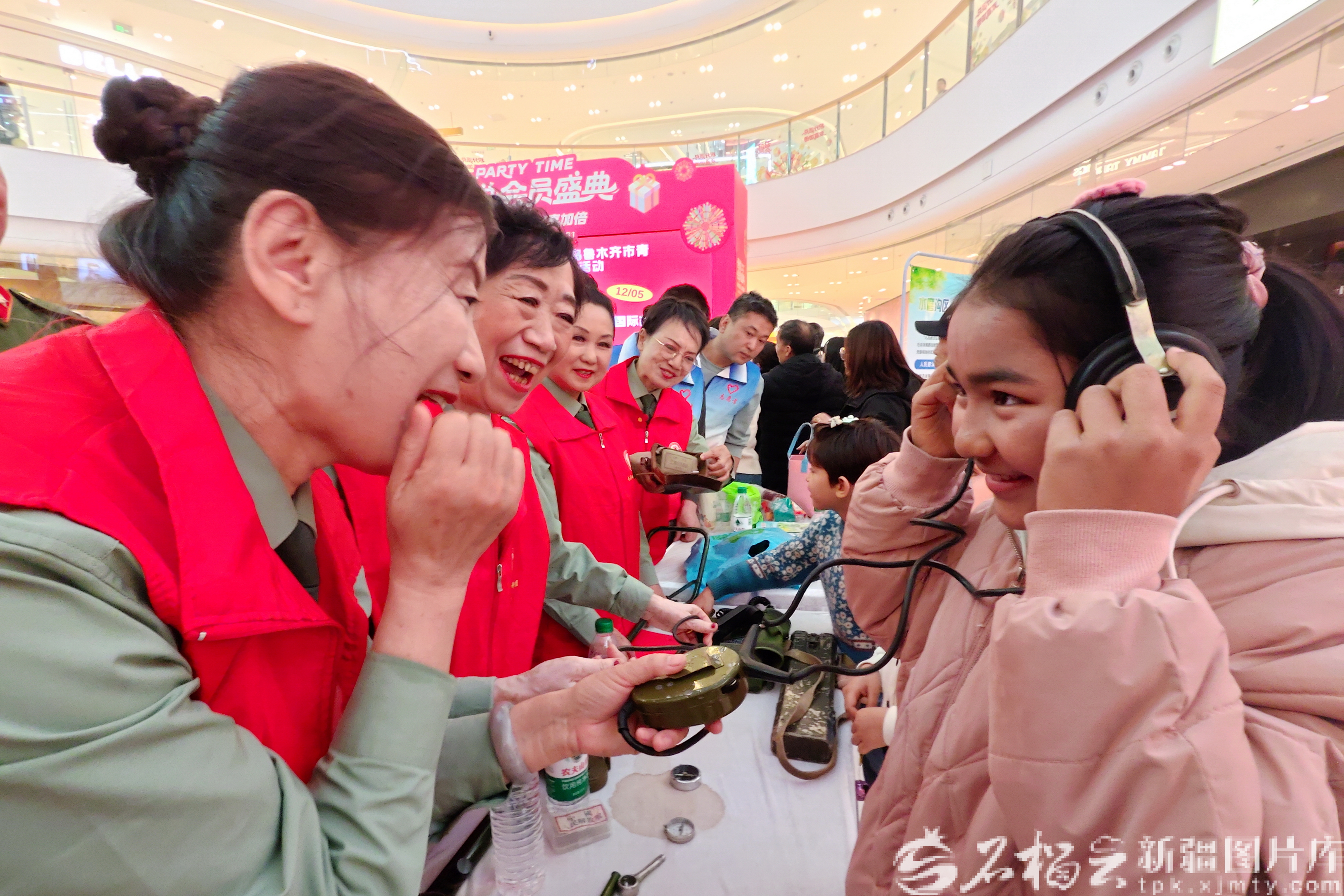 12月5日,一位小朋友在乌鲁木齐市老兵公益志愿服务联合会展位体验50年前的步话机。石榴云/新疆日报记者 秦鹏摄