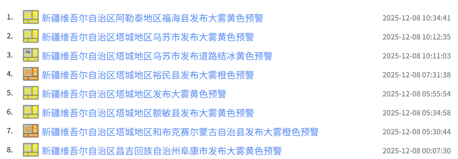 据新疆气象局发布的预警消息显示,8日白天,博州东部、塔城地区南部、克拉玛依市、石河子市、乌鲁木齐市、昌吉州等地的局部区域断续有阴雾或阴雪天气,部分路段结冰和能见度低,需防范大雾对交通安全影响。