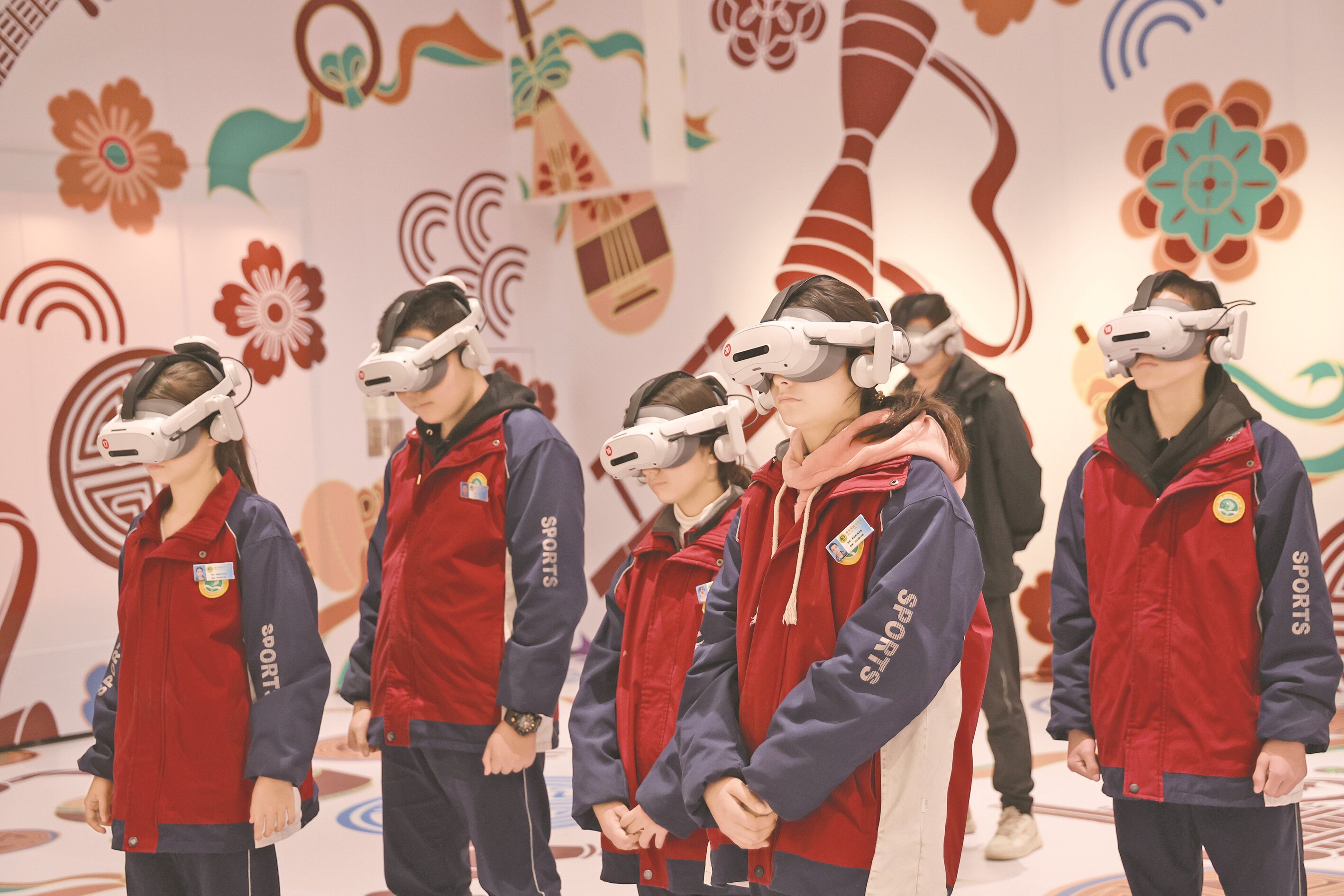 前来参观的学生戴上VR设备体验“时空穿梭”。王陇江 摄