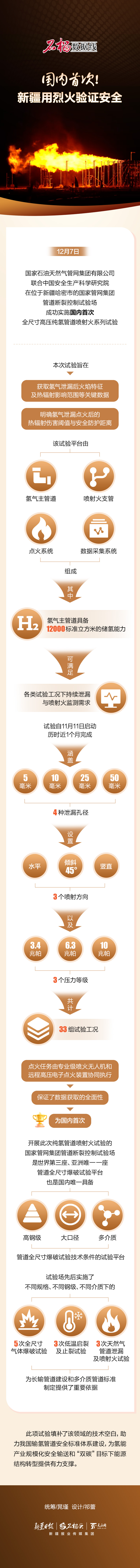 12月7日,国家石油天然气管网集团有限公司联合中国安全生产科学研究院,在位于新疆哈密市的国家管网集团管道断裂控制试验场,成功实施国内首次全尺寸高压纯氢管道喷射火系列试验。
