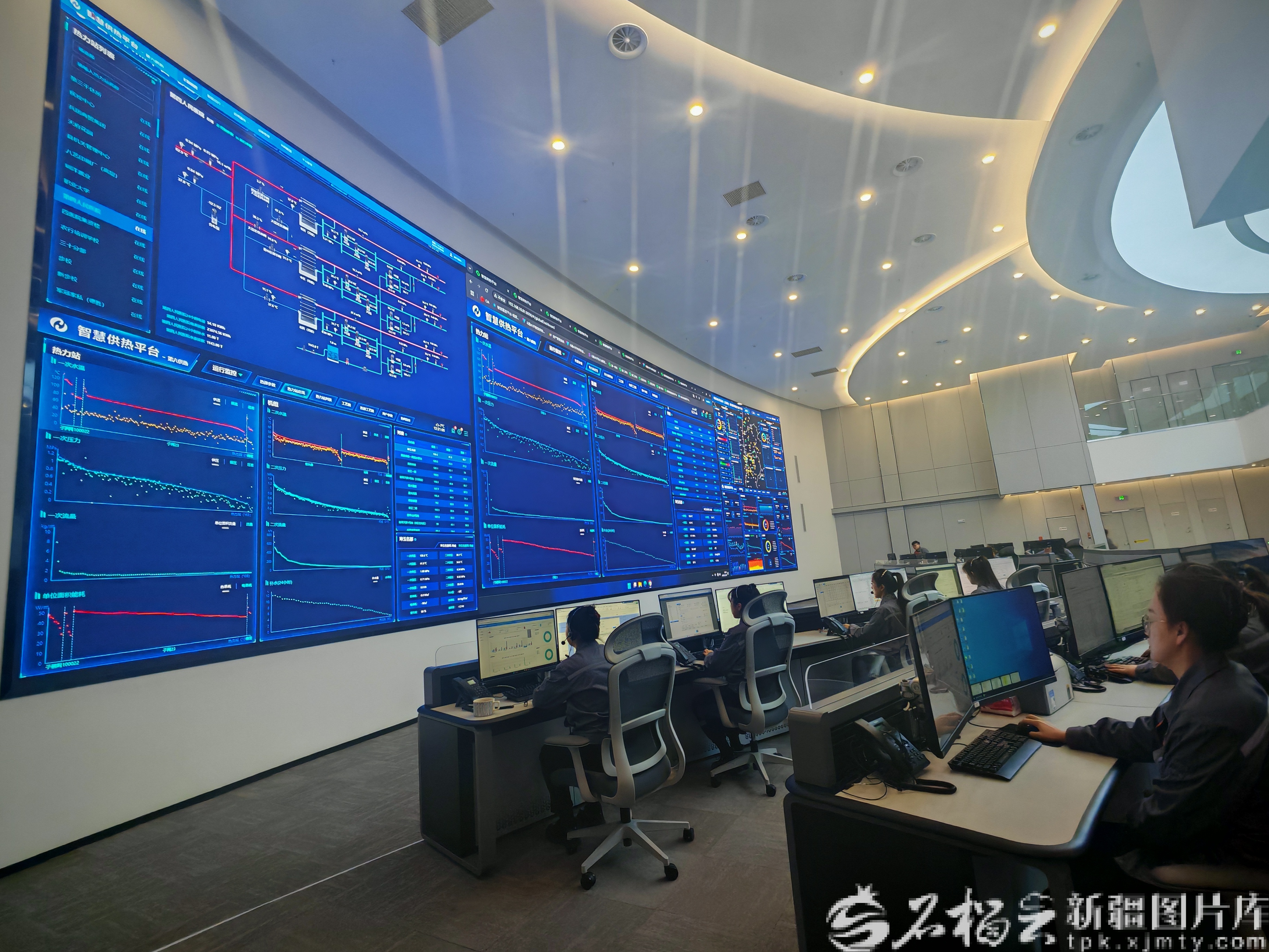 12月10日,乌鲁木齐热力(集团)有限公司智慧供热调度指挥大厅,大屏幕上显示供热系统运行数据。木拉迪力·吐尔洪摄