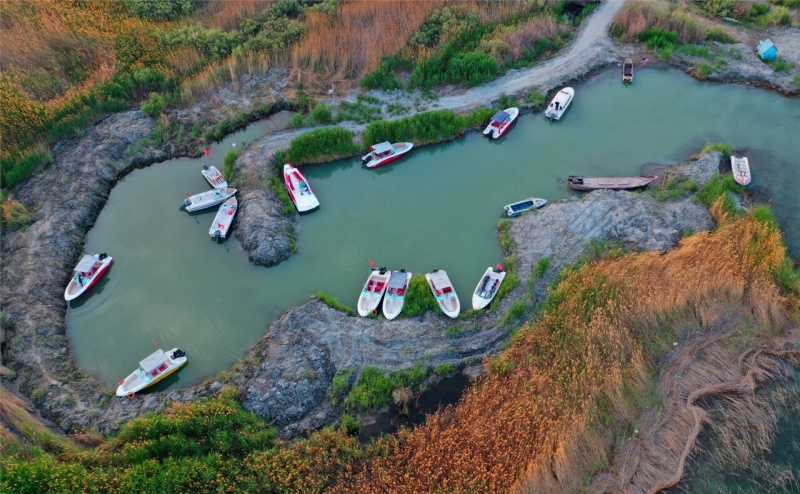 停放在和硕县金沙滩文旅度假小镇待检的游船。