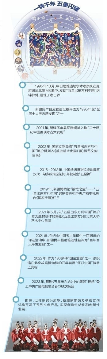 今年恰逢“五星出东方利中国”锦护臂出土30周年,和田、乌鲁木齐、北京等地陆续举办系列纪念活动,这件曾沉睡于塔克拉玛干沙漠的国宝,成为见证新疆繁荣发展、中华文化传承的鲜活载体。从尼雅遗址的流沙深处到现代舞台的聚光灯下,从考古发掘的惊世发现到文旅融合的创新实践,这片织锦不仅镌刻着中华文明多元一体的历史密码,更清晰照见了新时代盛世新疆的蓬勃气象。