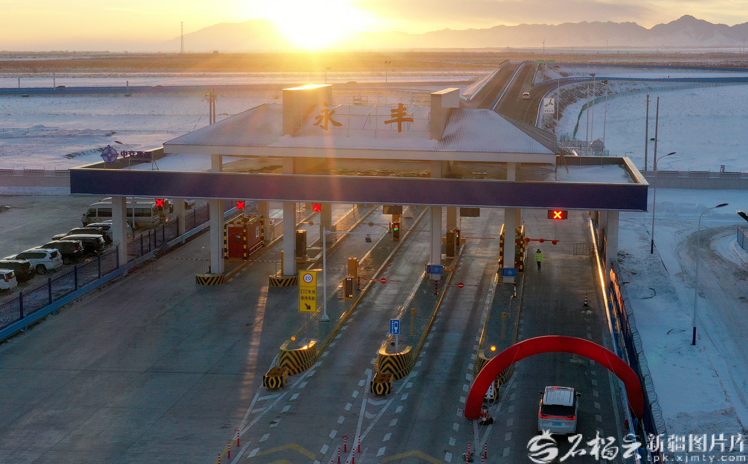12月26日,无人机航拍的乌尉高速公路永丰匝道收费站。石榴云/新疆日报记者 韩亮摄