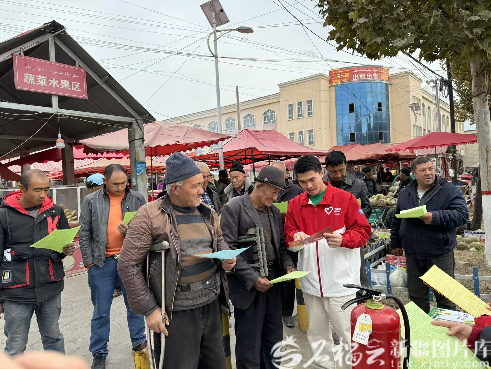 近日,杨烁桦(前右一)在巴扎上向群众宣传消防安全知识。本人供图