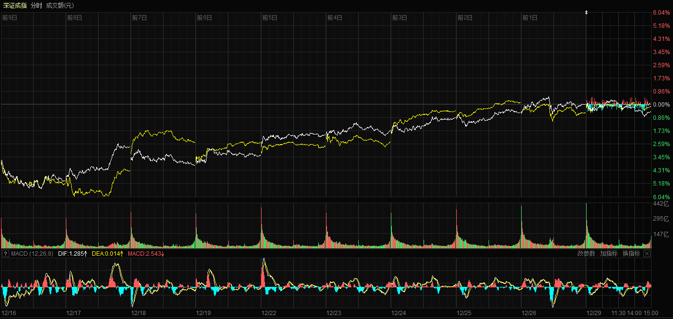 天山网-新疆日报讯(记者康颢严报道)12月29日,A股三大指数涨跌不一,沪指日线九连阳。截至收盘,沪指涨0.04%,报收3965.28点;深证成指跌0.49%,报收13537.10点;创业板指跌0.66%,报收3222.61点。沪深两市成交额21393亿元,较上一交易日小幅缩量209亿元。