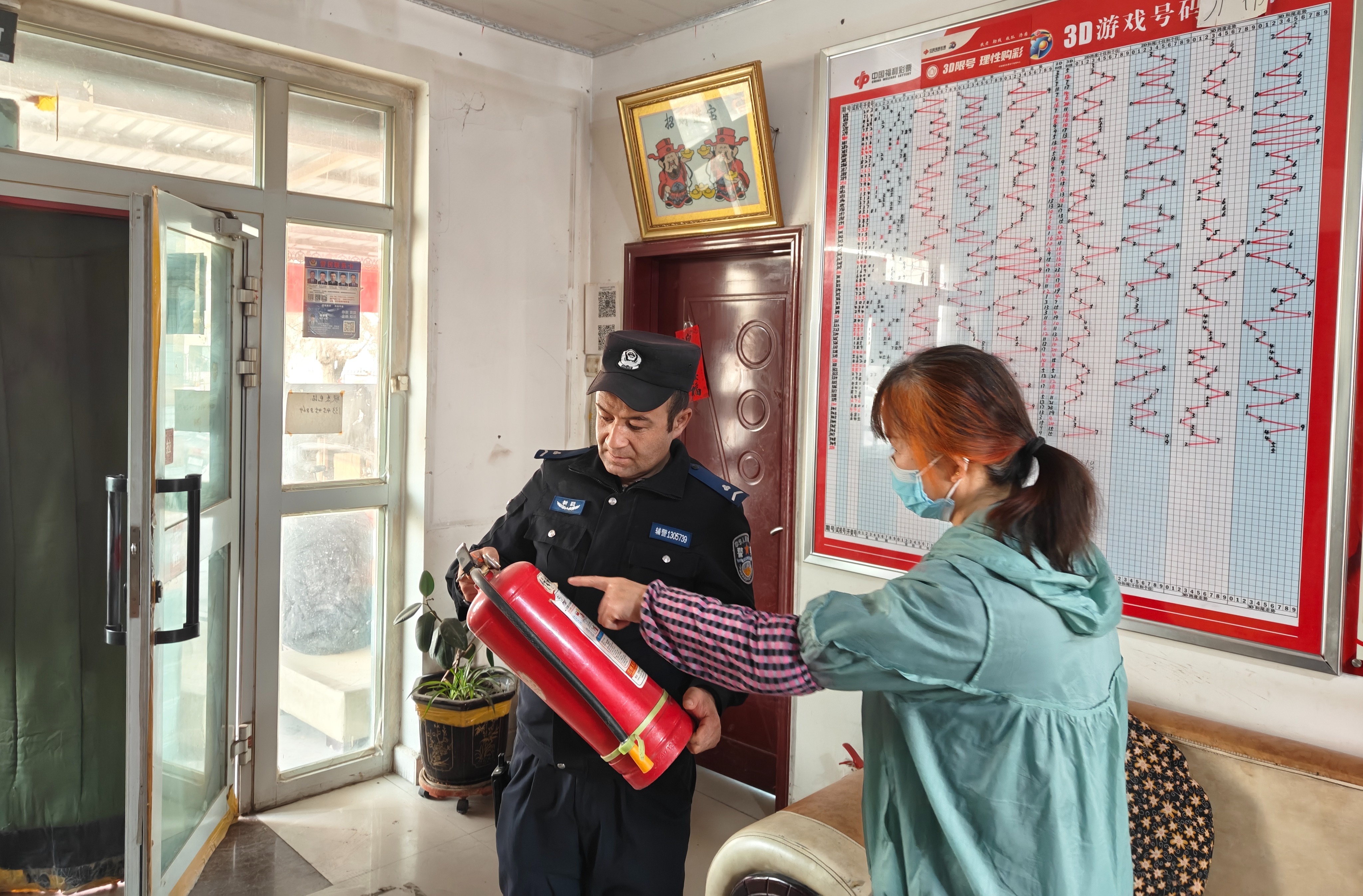 11月26日,塔温觉肯乡派出所辅警在辖区商铺开展消防安全检查。通讯员 李善坤摄