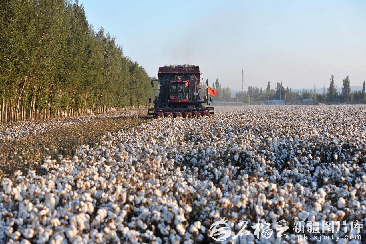 10月4日,彩棉机在沙湾市安集海镇和平新村棉田里作业。(资料图片)