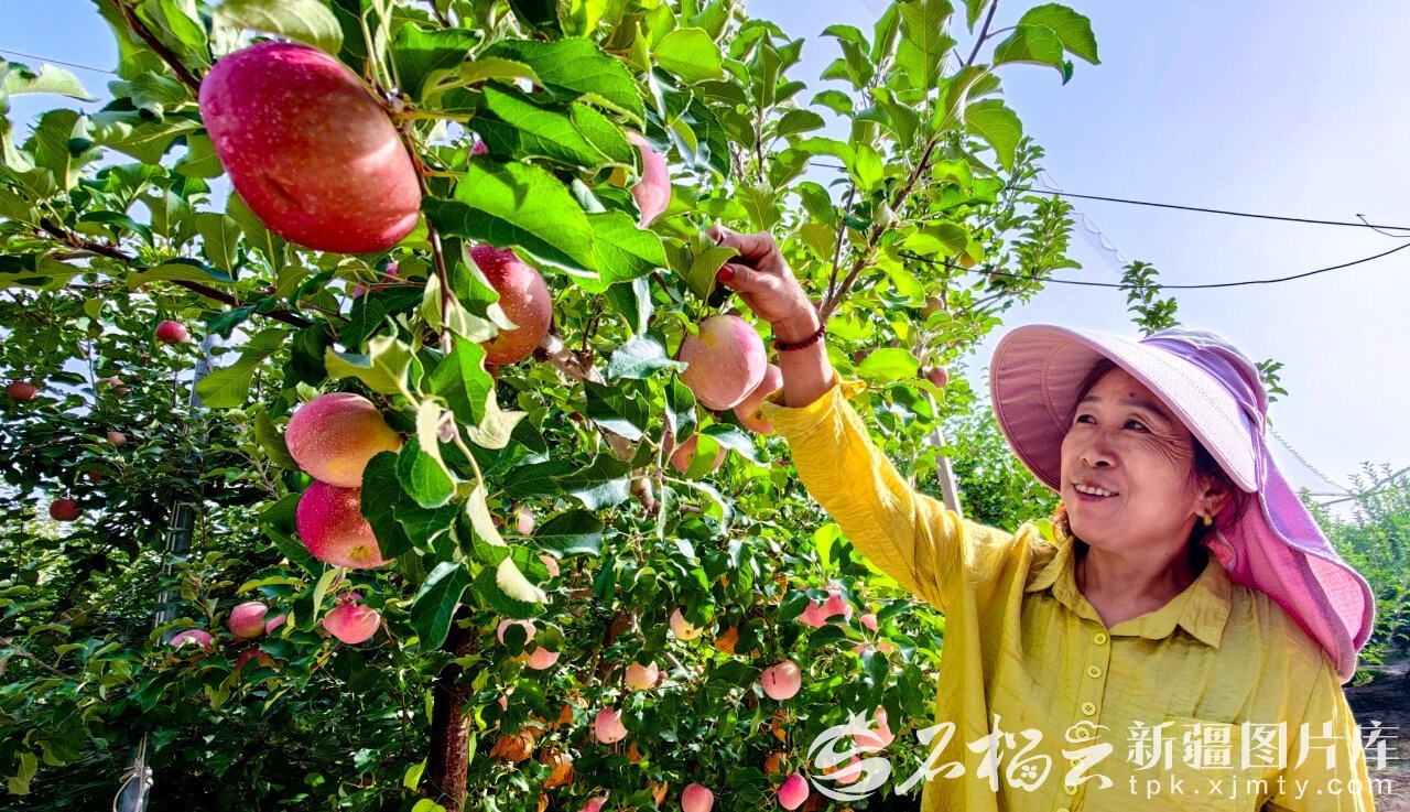 9月11日,一名农民在位于阿克苏市丰庆园果品农民专业合作社苹果园内观察苹果长势。(资料图片)