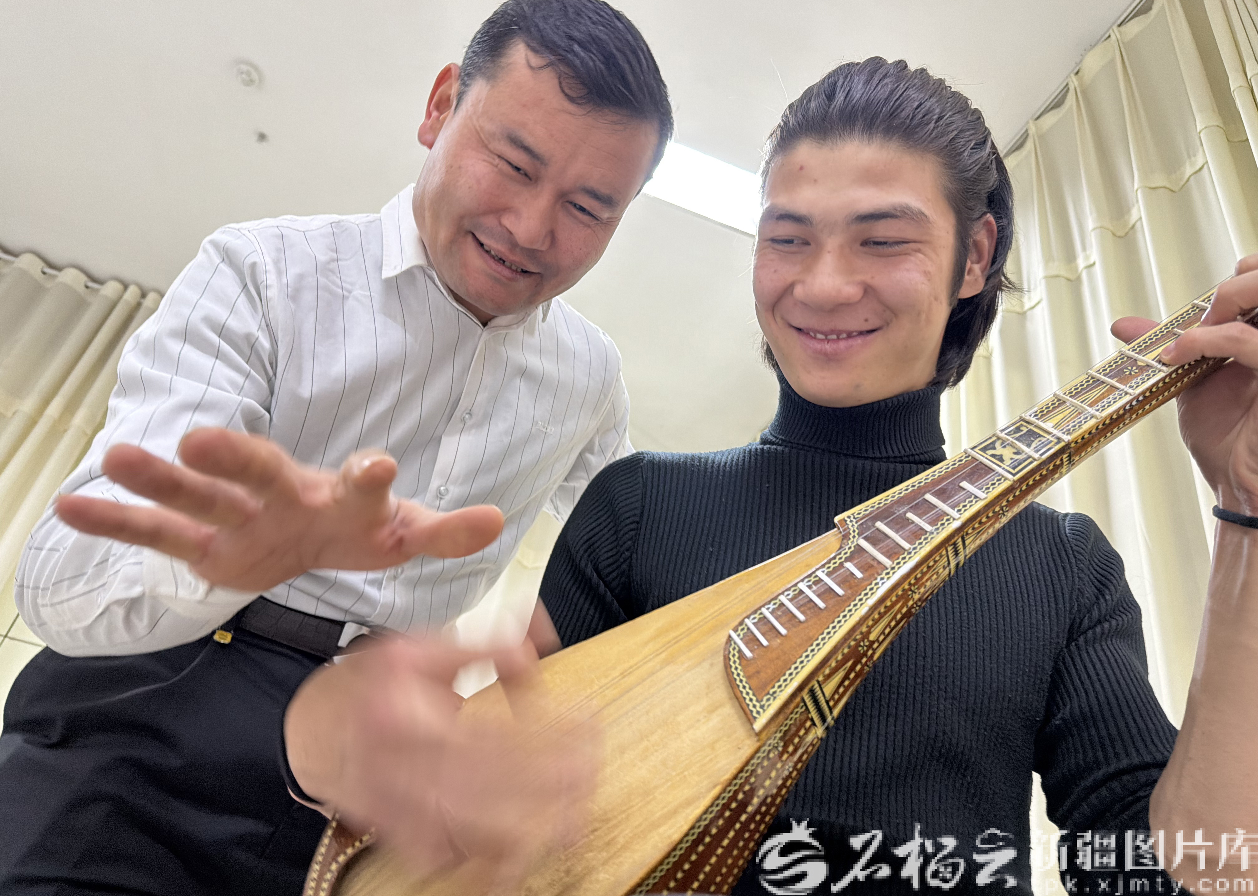 2025年12月31日,曼苏尔江在教授徒弟弹奏民族乐器。