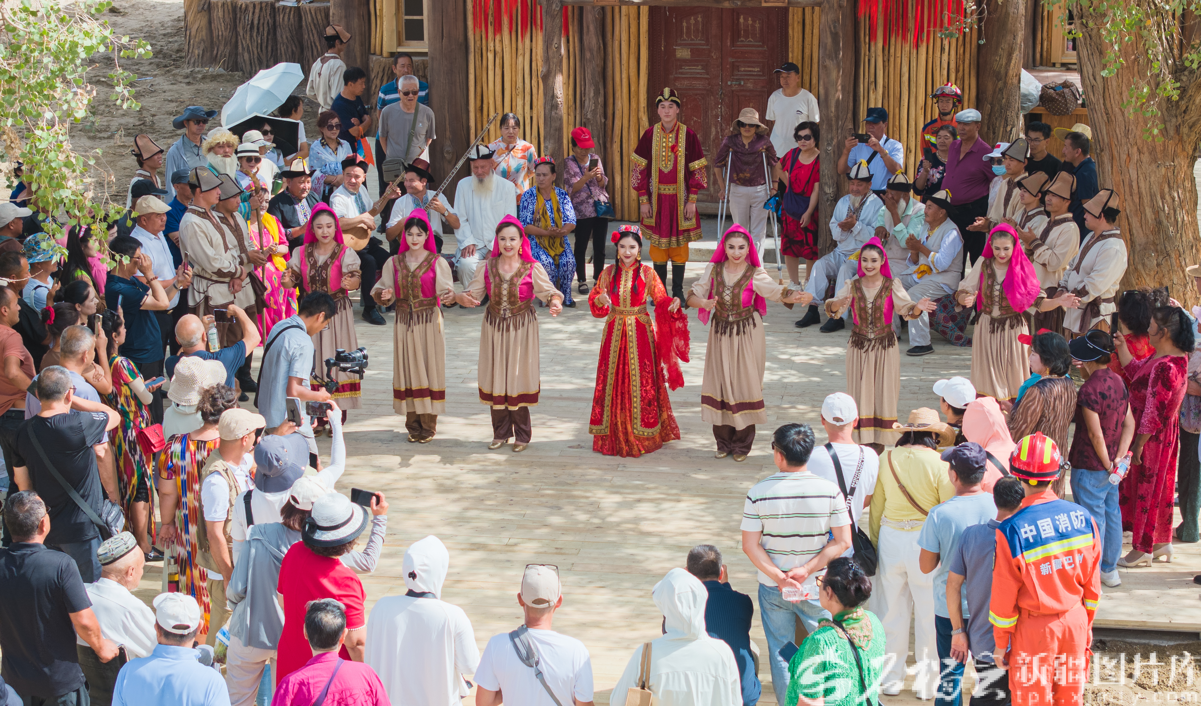 2025年8月28日,演员们在尉犁县罗布人村寨景区为游客表演罗布淖尔民歌。