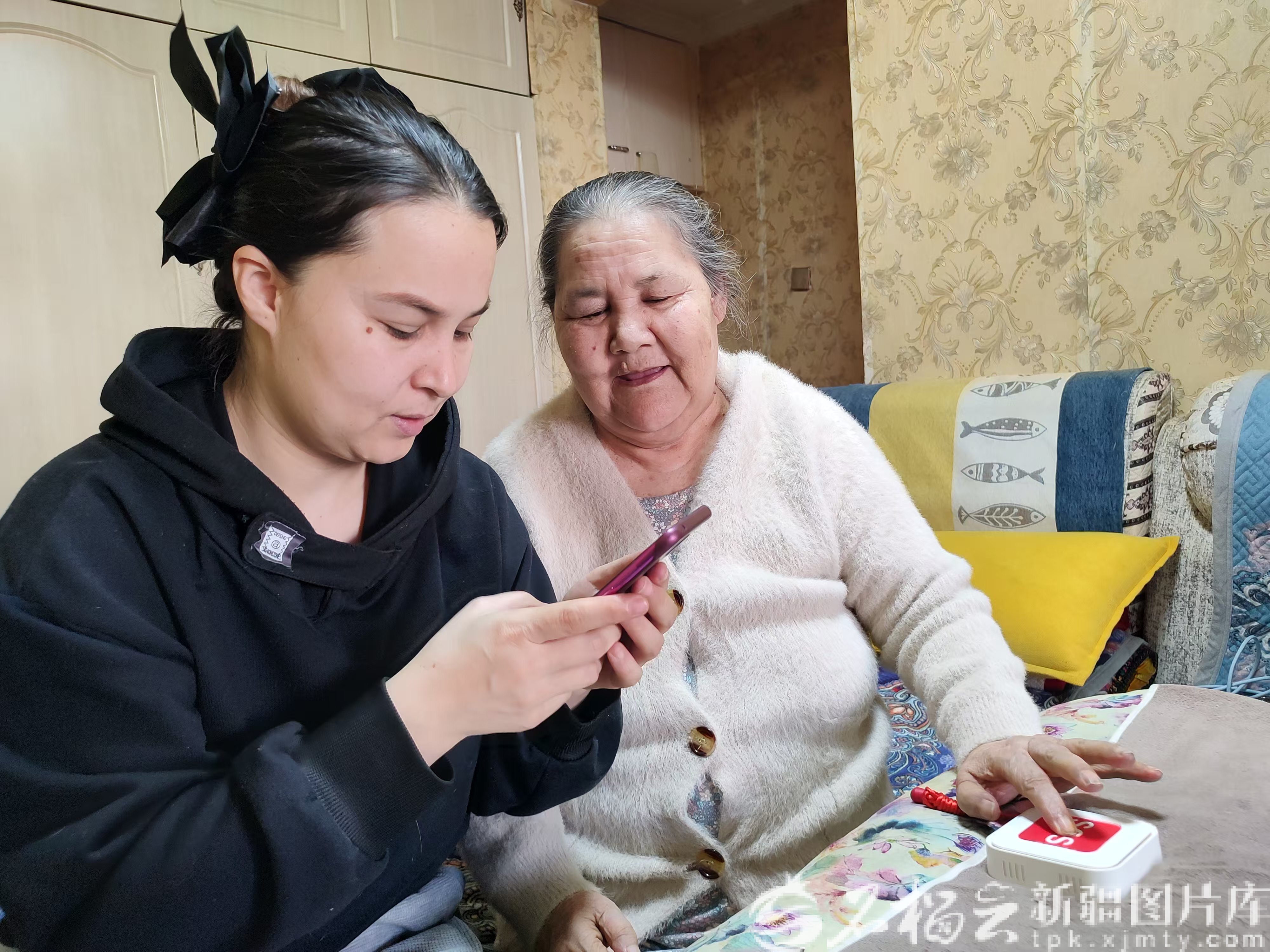 短短几天,这个家迎来了“生活革新”:卫生间装上了稳固的沐浴椅,玛依努尔洗澡时可稳稳落座;防滑垫牢牢锁住地面,消除了滑倒隐患;马桶旁的扶手让她仅凭自身力量就能起身。客厅里,360度智能摄像头让阿依仙木外出时能随时查看母亲状况;印着红色“SOS”的呼叫器更是“安全纽带”,轻轻一按,母女即刻通话。