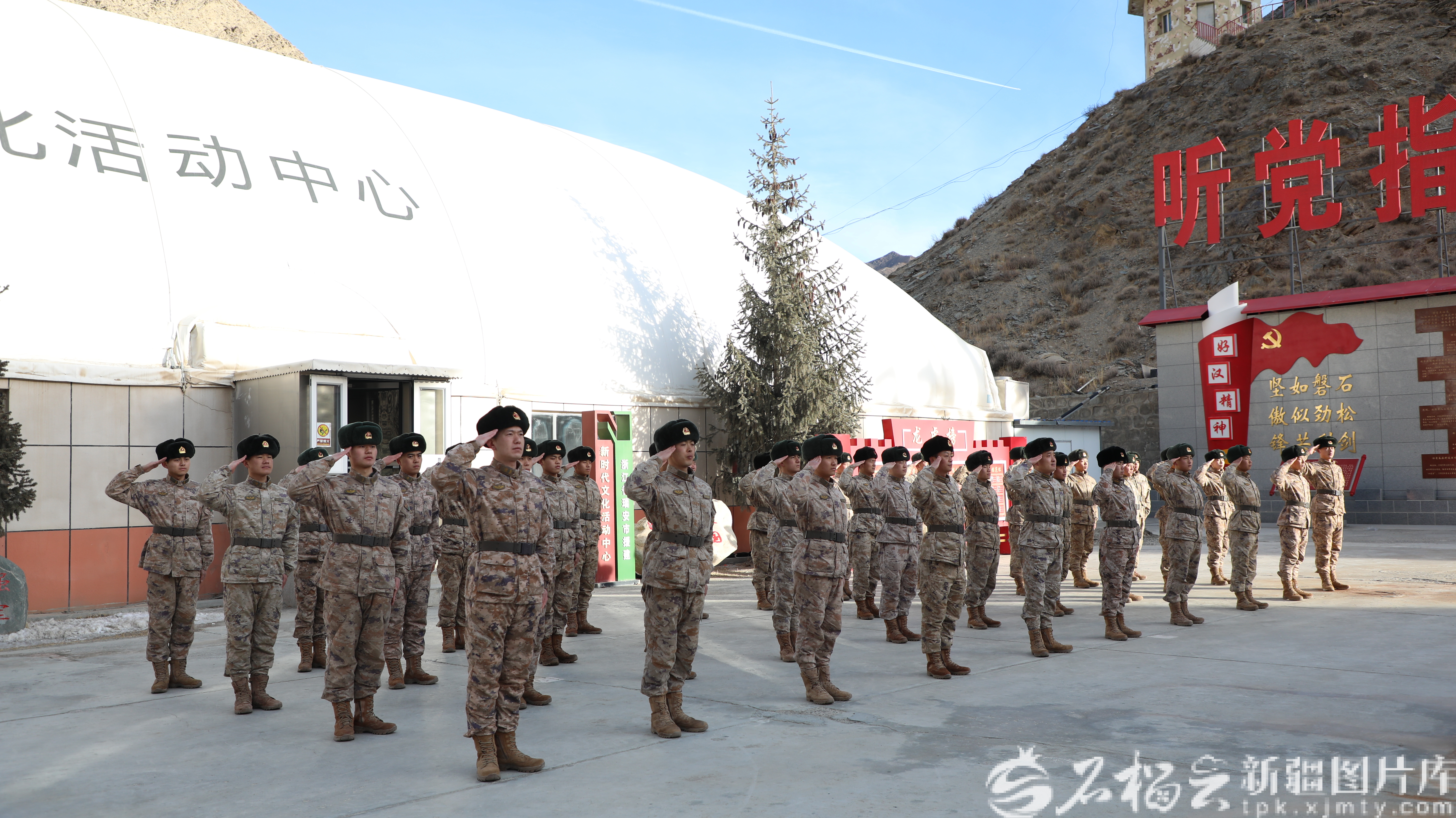 1月1日,阿克苏地区乌什县,新疆军区别迭里边防连营区的“好汉墙”前,连队官兵们军容严整、精神振奋,隆重举行元旦升国旗仪式。梁子良 摄
