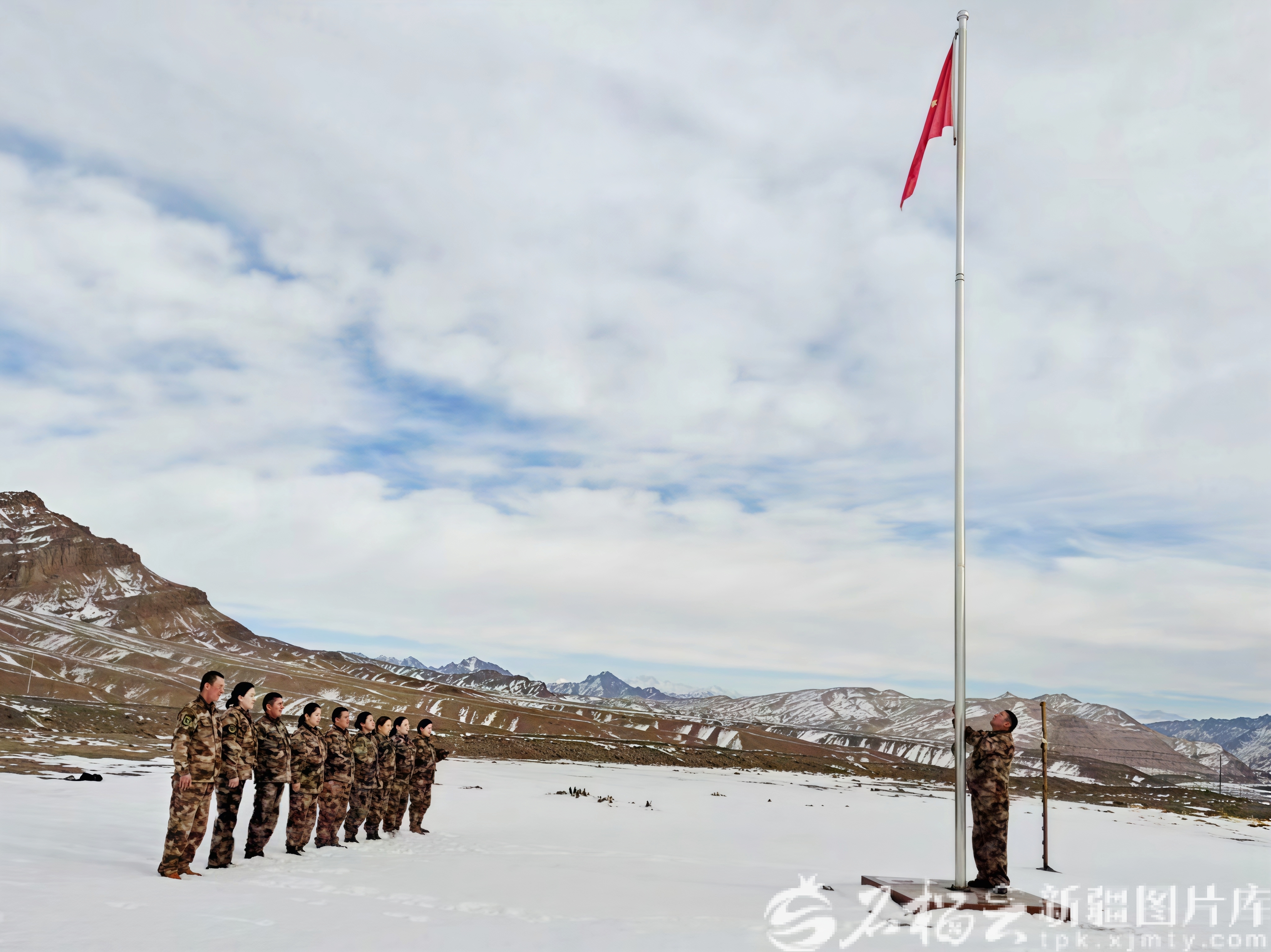 在乌什县境内的新疆军区别迭里边防连营区内,“好汉墙”前五星红旗冉冉升起。数九寒天,官兵们军容严整、精神振奋,隆重举行升国旗仪式。