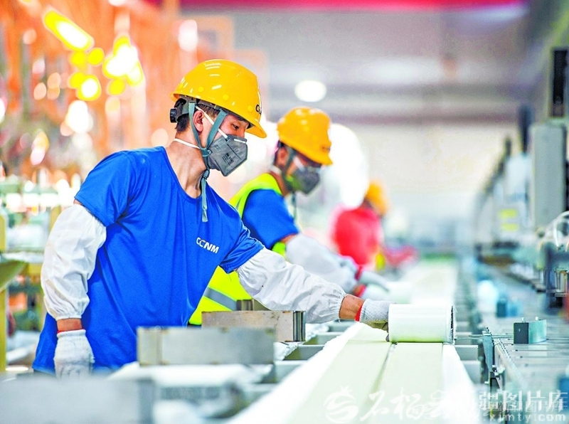 工人在位于昌吉国家高新技术产业开发区的新疆成飞新材料有限公司风电叶片生产基地作业。目前,该企业4条百米级风电叶片生产线正满负荷运转赶制订单产品,预计年产值可突破6亿元。何龙 摄