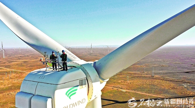 深圳能源集团股份有限公司新疆分公司木垒200兆瓦风力发电场员工巡检风机。目前,木垒工业园区总装机容量2000万千瓦,是“疆电东送”主要的风电新能源产区之一。周游 摄