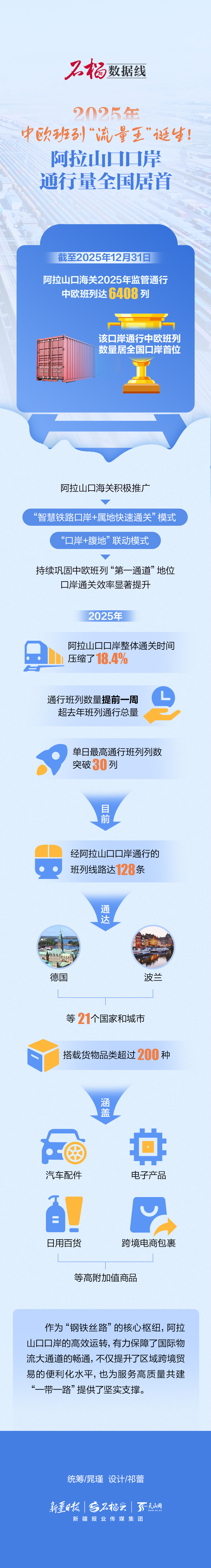 截至2025年12月31日,阿拉山口海关2025年监管通行中欧班列达6408列,该口岸通行中欧班列数量居全国口岸首位。