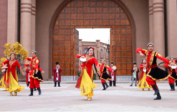 1月3日的麦盖提,寒意仍浓,但“刀郎·记忆”演艺广场上却暖意融融。在星期六的开城仪式上,“乐舞刀郎”主题展演如期上演,为现场观众带来了一场沉浸式刀郎文化盛宴:舞蹈《萨玛》刚劲洒脱,歌伴舞《吼嗨》诙谐逗乐,集体舞《欢迎你到新疆来》热情洋溢,歌伴舞《朱拉》灵动优美。悠扬的热瓦甫琴声响起,演出团队人员身着民族特色服饰,以刚劲有力的舞姿、极具感染力的节奏点燃了现场氛围;民间艺人轻拨卡龙琴弦,醇厚歌声穿越人群,观众纷纷举起手机拍摄留念。