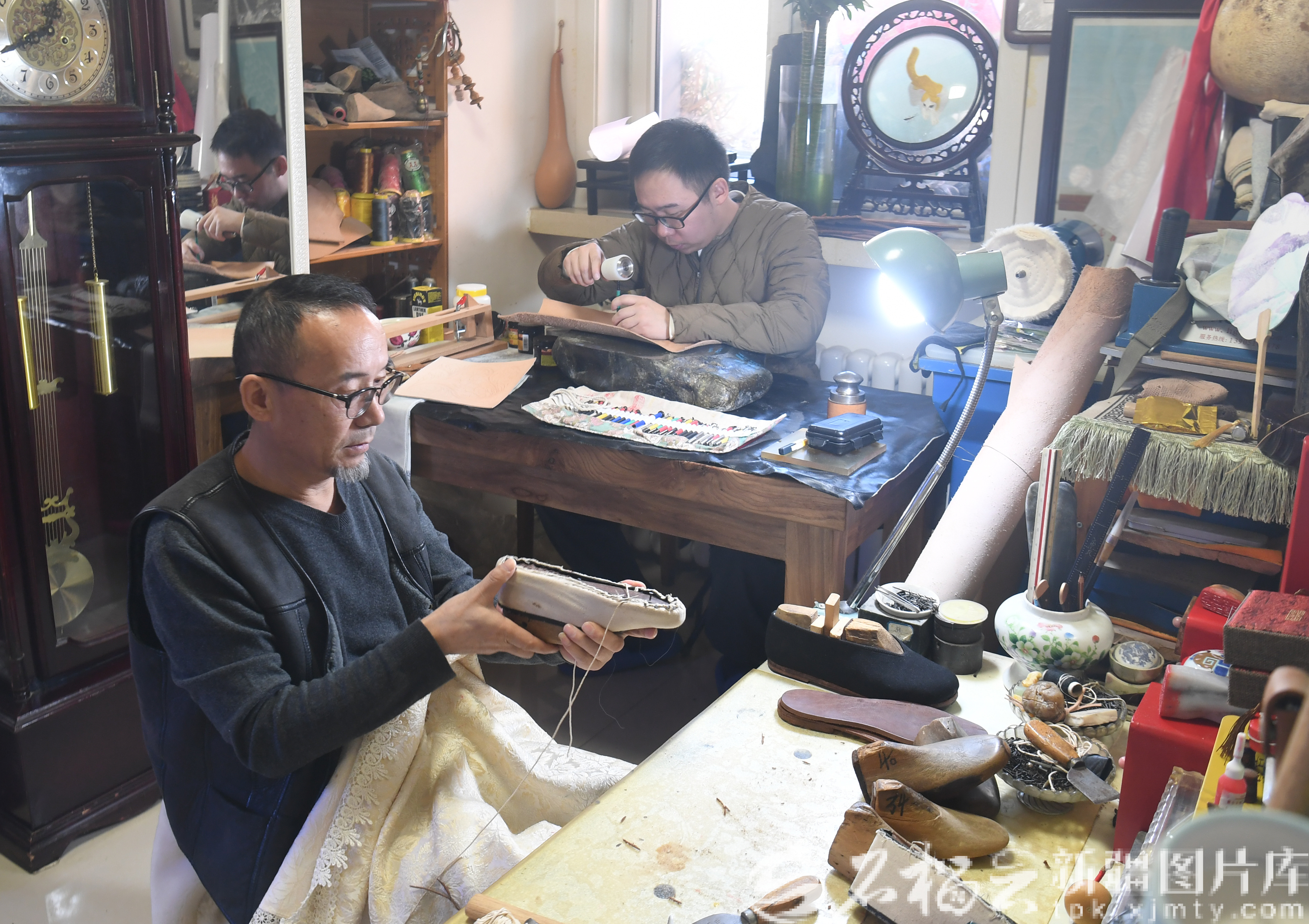 天山网-新疆日报讯(记者韩亮摄影报道)1月9日,位于乌鲁木齐市克拉玛依东街的杨氏手工制鞋坊内,手工鞋制作技艺第五代传承人杨波正凝神专注于手中的活。“一双手工鞋要经过裁剪鞋帮、缝口嵌边、绱鞋、烘烤等40余道工序,耗费5天时间才能完成。”杨波手中摩挲着一块温润的皮革,“我们选伊犁旱牛皮做鞋底,一级牛皮做鞋面,这皮子油性足、质地软,手工缝制出来的鞋,上脚才够舒坦。”