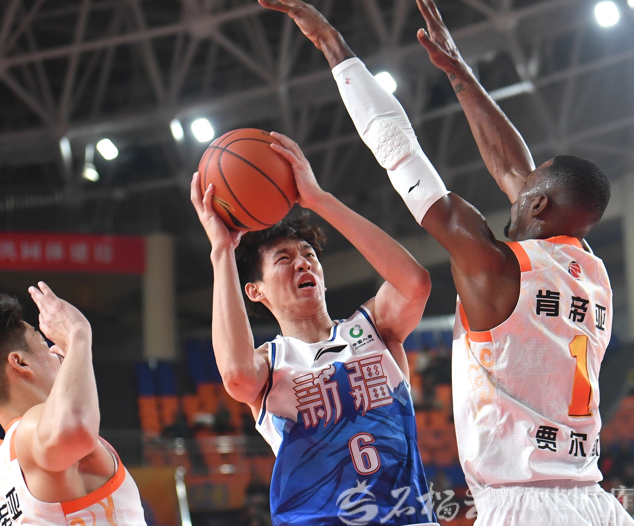 1月11日,新疆男篮球员伊力福拉提(右)远投三分球。天山网-新疆日报记者 邹懿 摄
