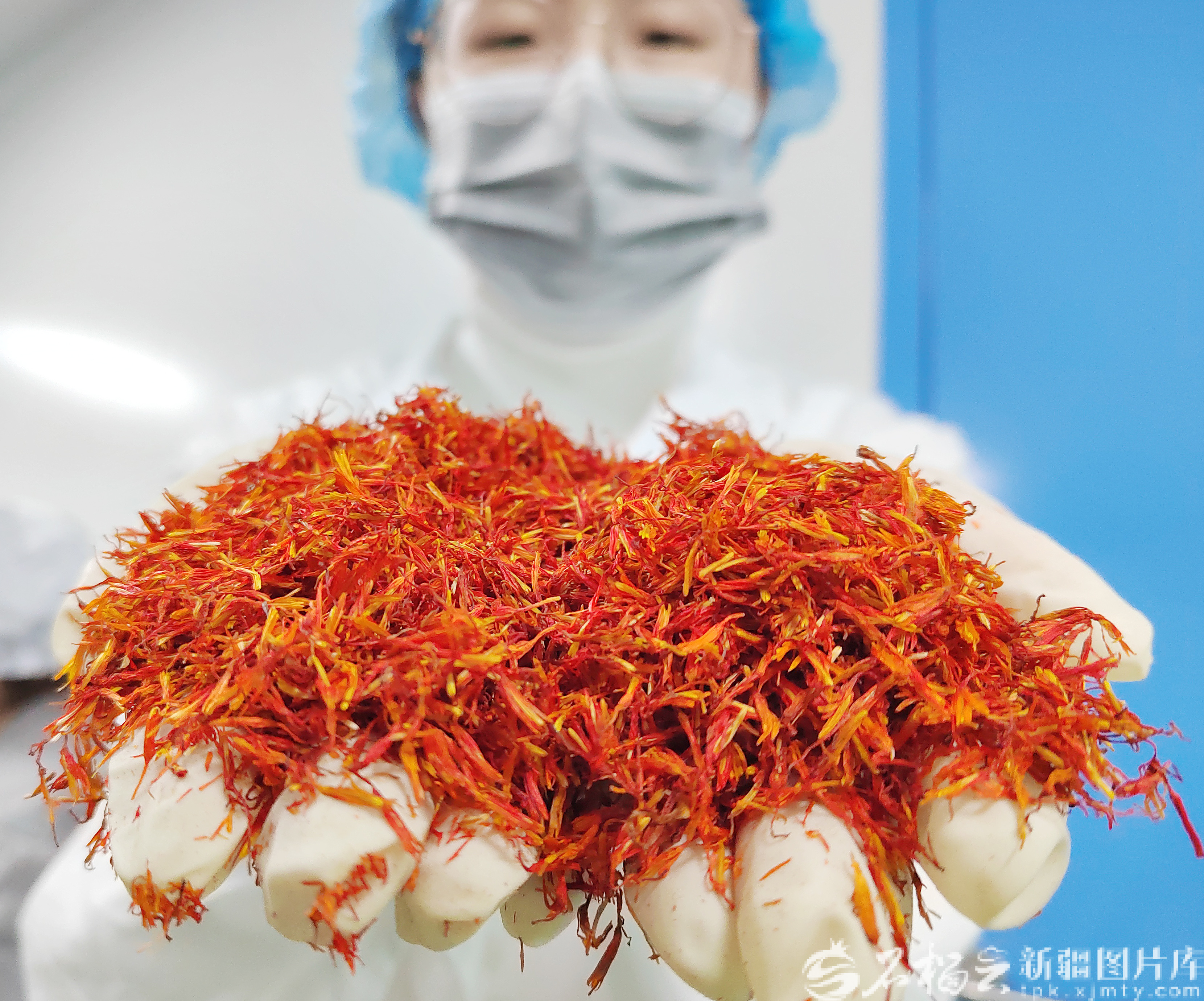 1月12日,工作人员展示经过色选机选出的红花。