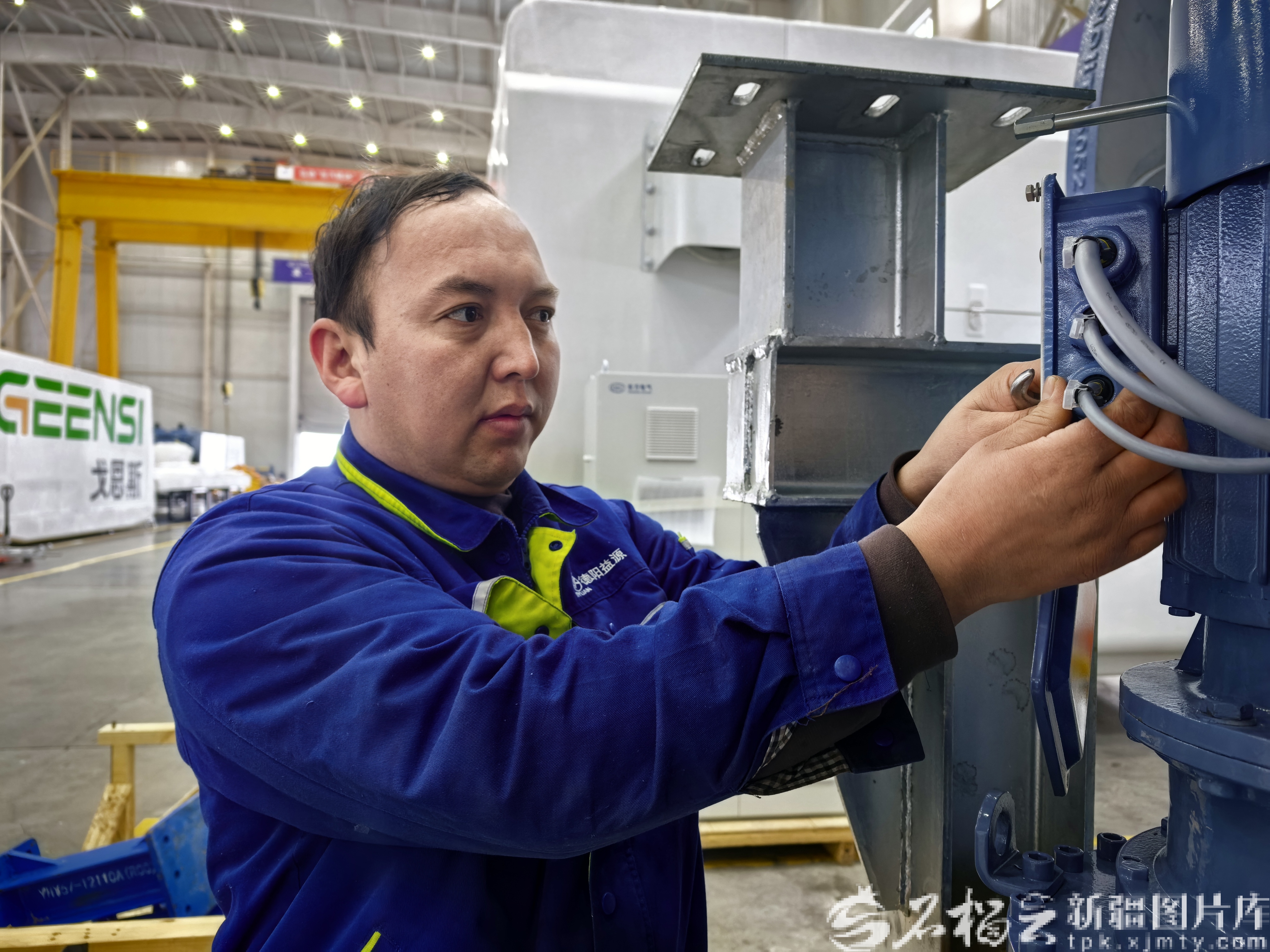 1月11日,木垒哈萨克自治县工业园区的新疆东方风电新能源有限公司新能源高端装备制造生产车间里,一台台硕大的风电机组主机正在组装,31岁的毕哈孜正娴熟地调试主机线路,指尖在线路间灵活穿梭。