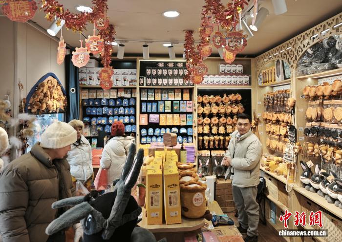 1月12日,在位于乌鲁木齐市的新疆国际大巴扎内,游客在阿凡提文创专卖店挑选商品。 苟继鹏 摄