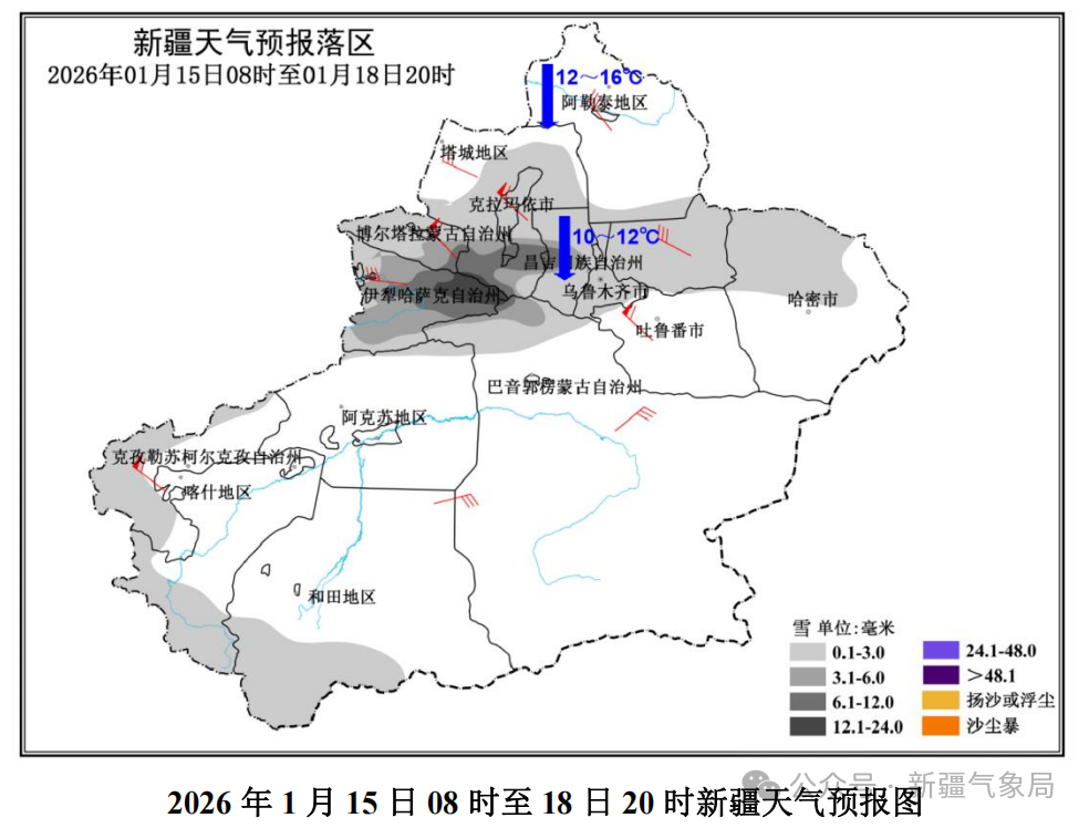 据新疆气象局微信预报消息,1月15日白天至17日白天,北疆西部、塔城地区、克拉玛依市、石河子市、乌鲁木齐市、昌吉州和南疆西部山区、巴州北部山区、哈密市等地的部分区域有小雪,其中伊犁河谷、塔城地区南部、石河子市、昌吉州西部、巴州北部山区等地的局部区域有中到大雪,伊犁州尼勒克县、新源县局部暴雪(累计降雪量12~20毫米、新增积雪15~25厘米)。强降雪时段:伊犁河谷在15日夜间至16日夜间。