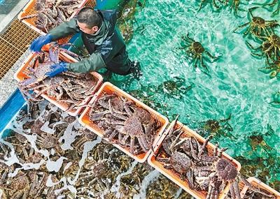 新疆吉木乃口岸优化通关服务,压缩通关时间,实现“即到即验”,让“丝路美食”加速走向餐桌。图为进口帝王蟹通过查验后准备装箱发往市场。记者 李亚楠摄