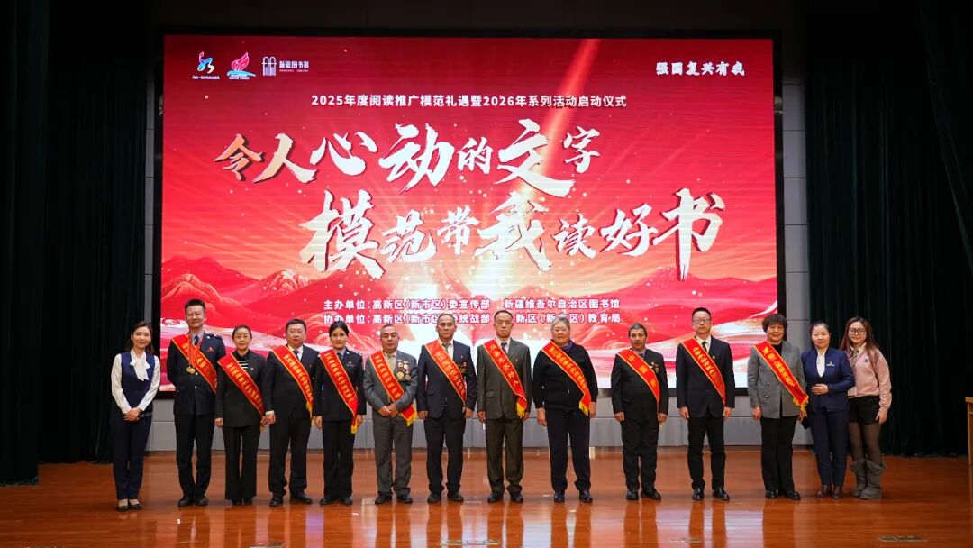 1月16日,新疆图书馆联合乌鲁木齐高新技术产业开发区(新市区)委宣传部举办“令人心动的文字 模范带我读好书”——2025年度阅读推广模范礼遇暨2026年系列活动启动仪式。全国民族团结进步模范海来提·哈得尔、自治区民族团结进步模范常宁等道德模范代表及居民读者等齐聚一堂,共赴书香之约,共启阅读新程。
