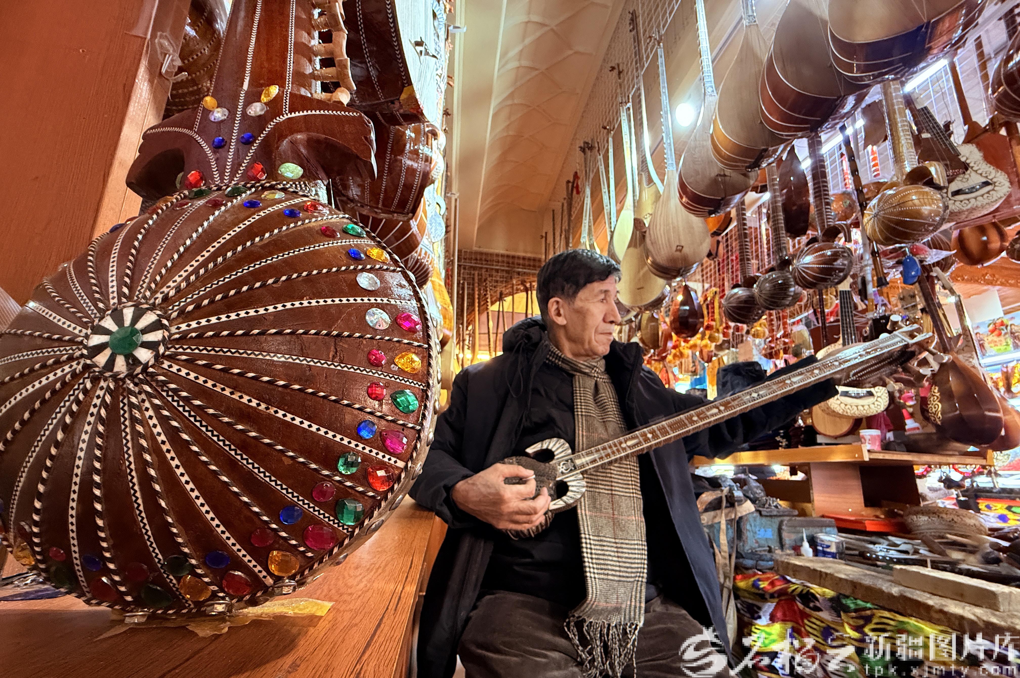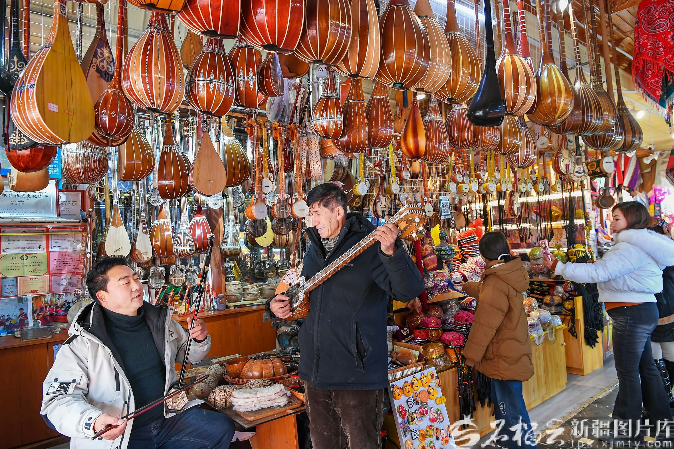 天山网-新疆日报讯(记者约提克尔·尼加提摄影报道)1月21日清晨,阳光漫过新疆国际大巴扎景区步行街的石板路,艾尔肯·吐么尔的乐器店里飘出悠扬的琴声。二胡的婉转与热瓦普的热烈交织缠绕。店内,来自贵州的乐器爱好者杨昭锦正与店主艾尔肯·吐么尔切磋弹奏技艺,两人虽初相识,指尖流转的默契却宛若相交多年的老友。“早就听闻艾尔肯师傅的制琴手艺出神入化,又同是爱琴之人,能和他交流切磋,不虚此行。”杨昭锦的话语里满是敬