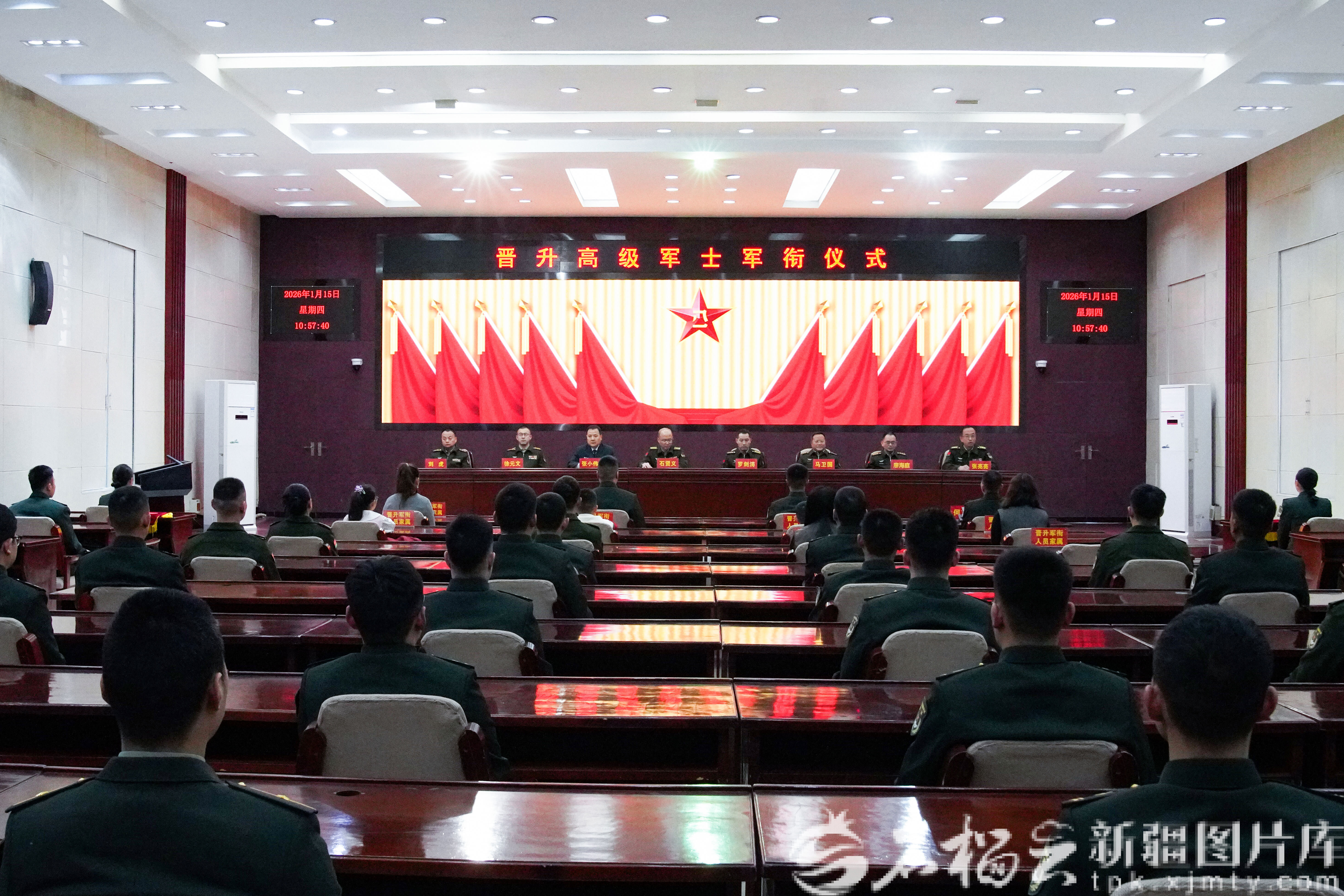 仪式在雄壮的国歌声中拉开帷幕。该部领导宣读了晋升军衔命令。三名服役超过16年、晋升军衔的高级军士军容严整、精神抖擞,以昂扬的姿态依次上前,郑重接过象征组织肯定与重托的命令状。肩章更换,荣光焕发;掌声雷动,敬意满怀。这一刻,廿载乃至更长的军旅岁月凝聚成闪亮的星徽,万里边关的风雪洗礼熔铸进庄严的肩章。