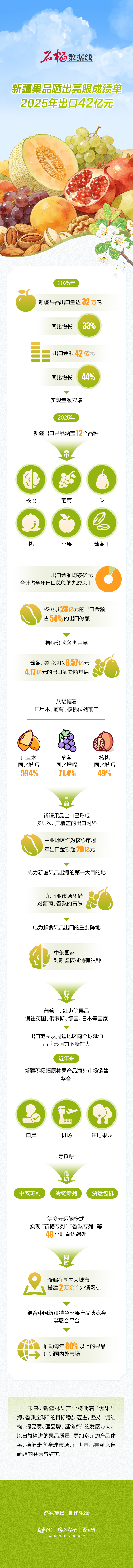 2025年新疆果品出口量达32万吨、出口金额42亿元,同比分别增长33%和44%,实现量额双增。