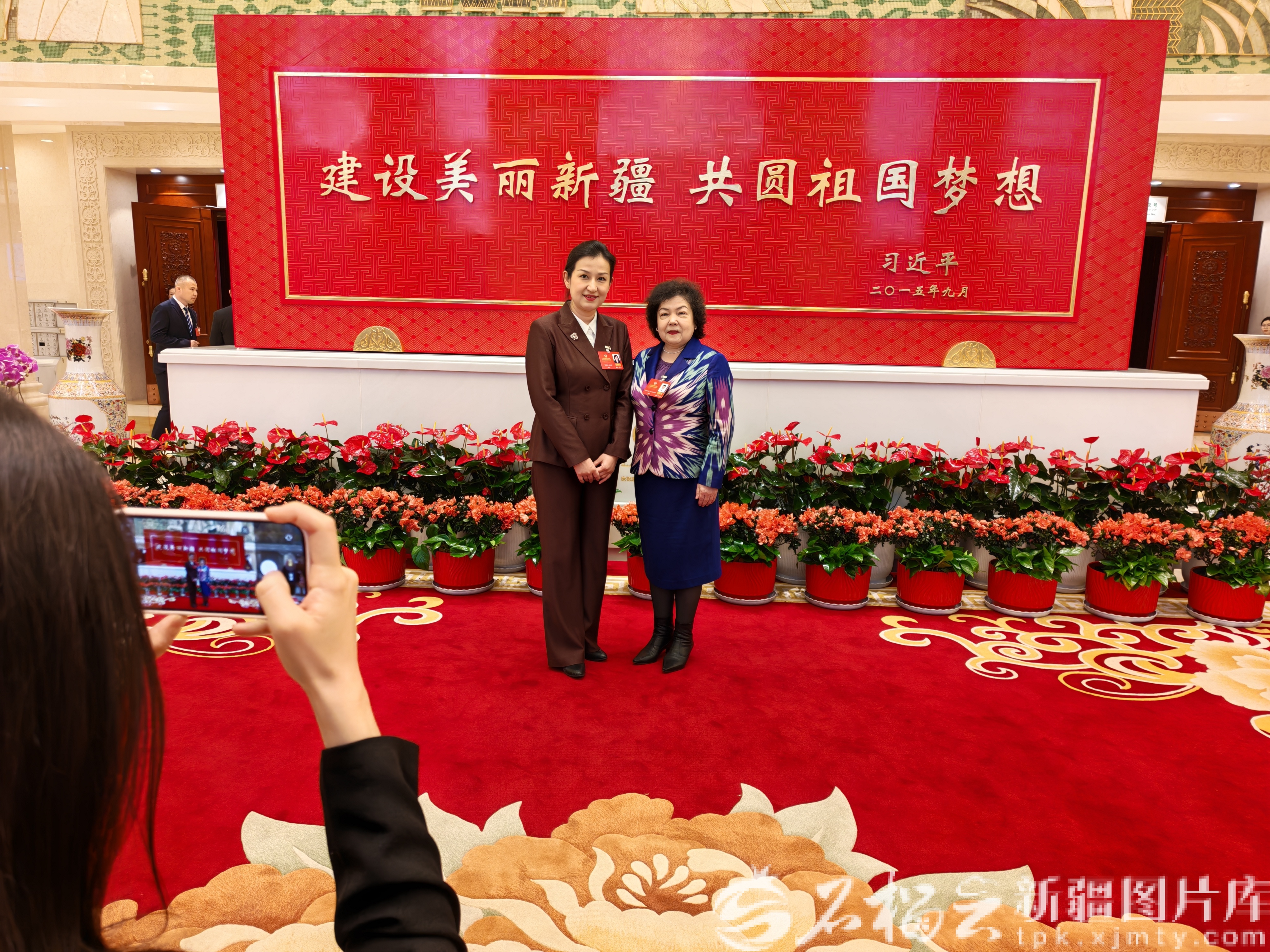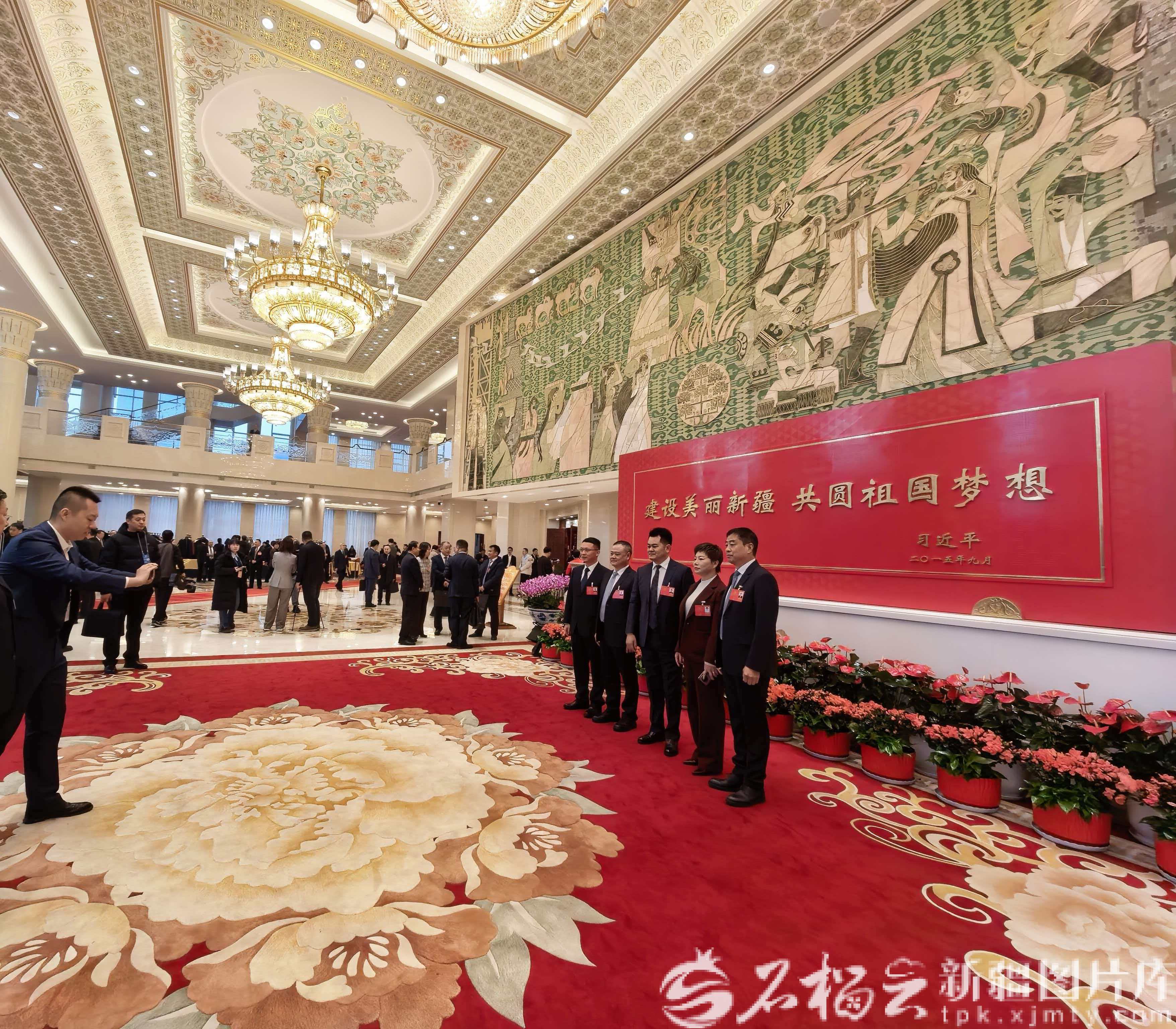1月26日上午,出席自治区政协十三届四次会议的政协委员在新疆人民会堂大厅交流。