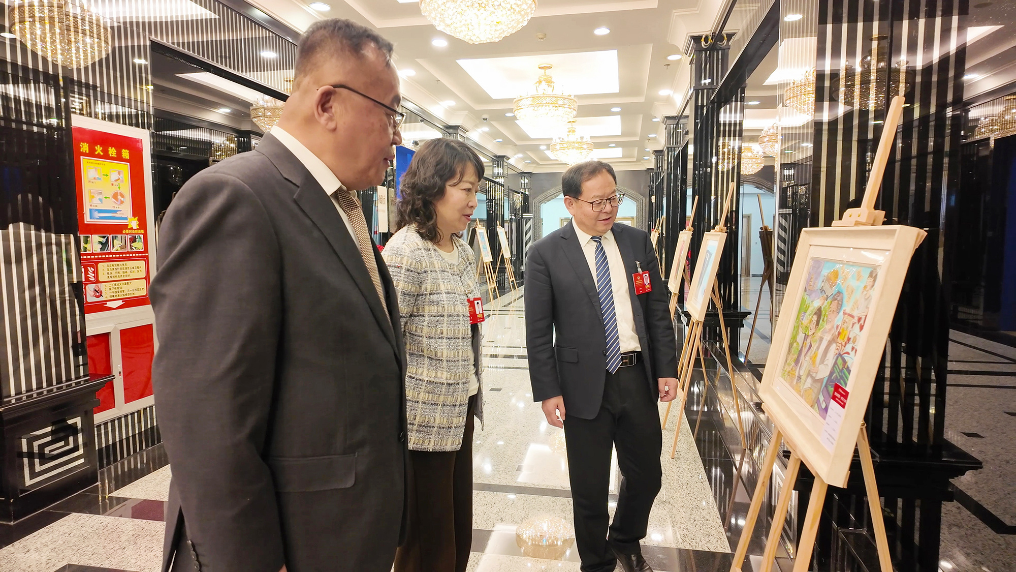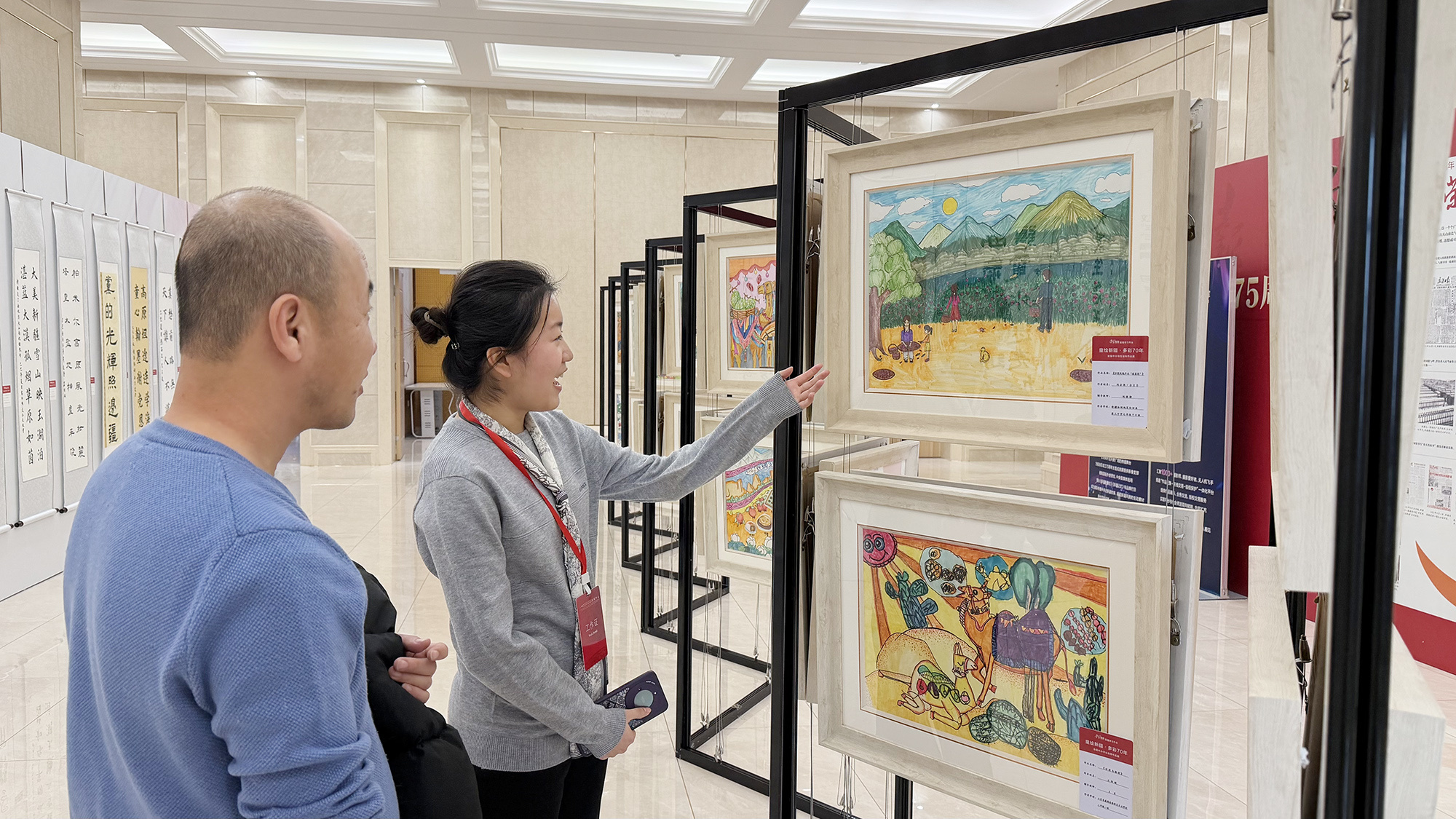 2026年新疆两会现场,“童绘新疆”“中国娃写中国字”书画作品成果展,吸引众多代表委员驻足欣赏。