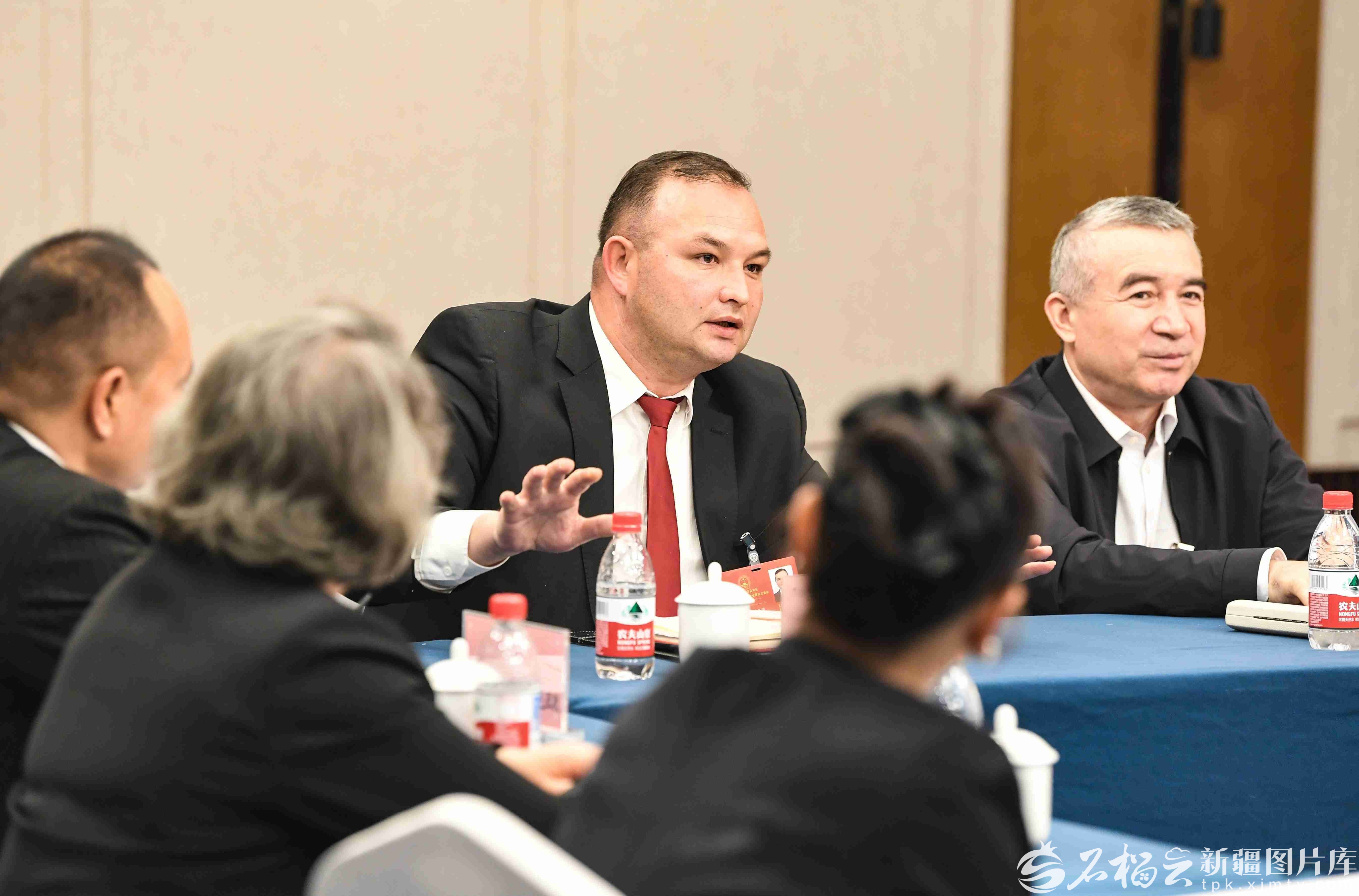 图为博尔塔拉蒙古自治州代表团代表在会议间隙一起交流。天山网-新疆日报记者 蔡增乐摄