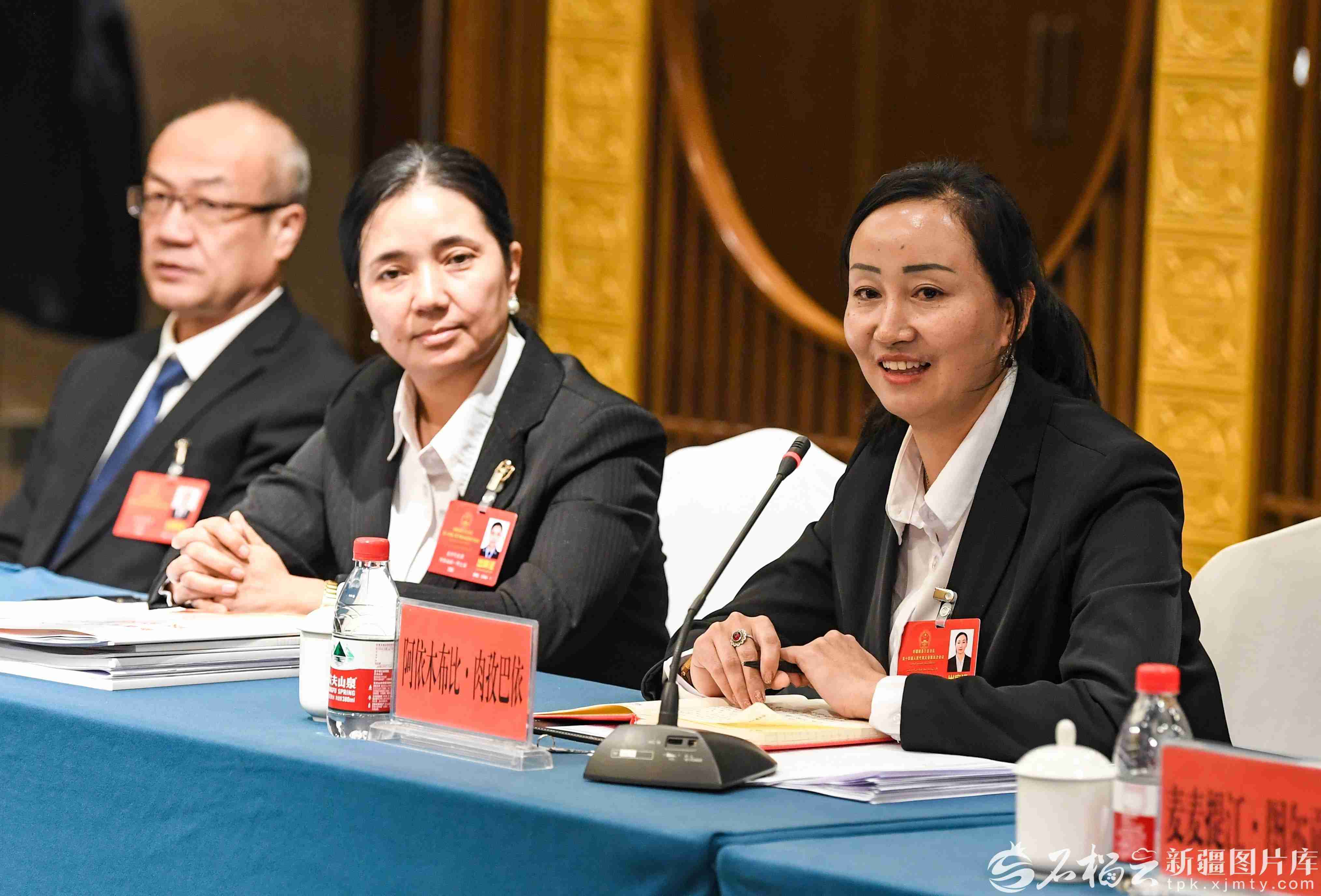 1月28日,排尔哈提·艾合麦提尼亚孜代表(右一)在参加和田地区代表团审议时,就坚持协调发展,促进乡村振兴等内容发言。天山网-新疆日报记者 汤永摄