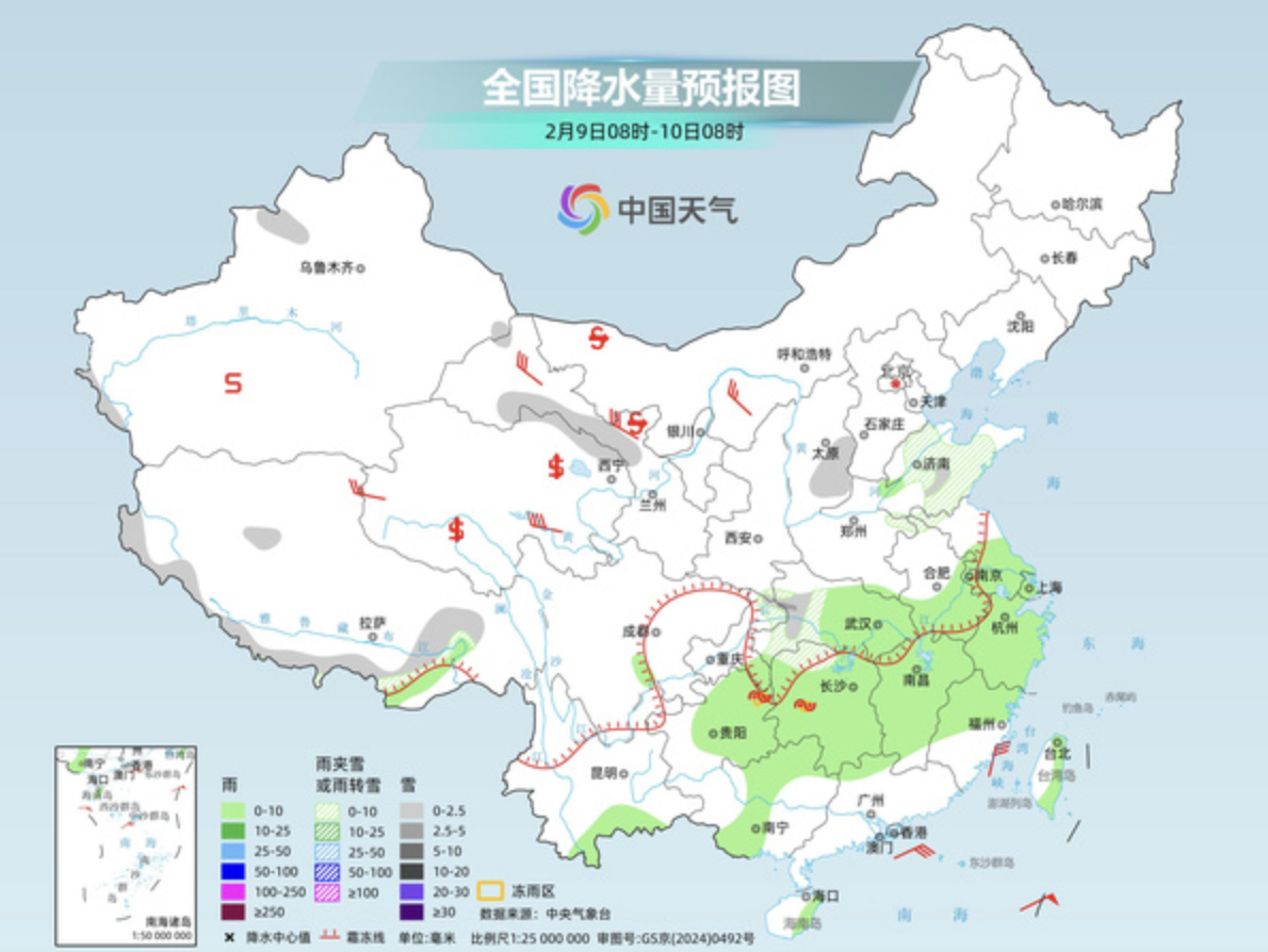 2月9日8时—10日8时全国降水量预报图。图片来源/中国天气网