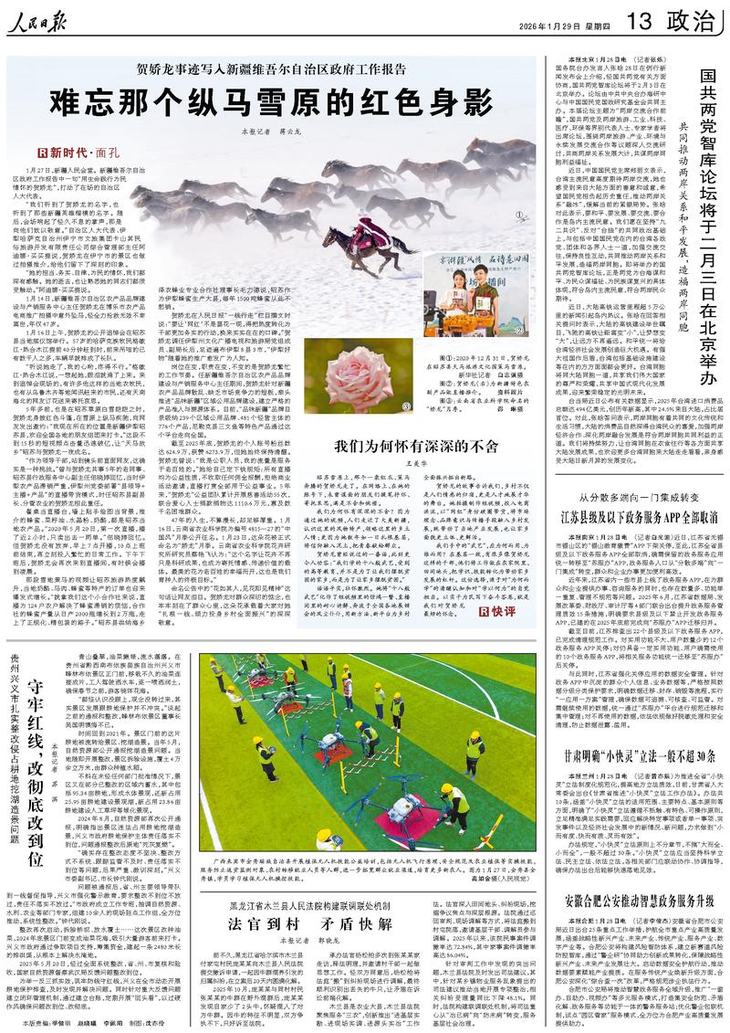 另一篇是人民日报1月29日刊发的文章《贺娇龙事迹写入新疆维吾尔自治区政府工作报告 难忘那个纵马雪原的红色身影》,报道回顾了贺娇龙生前的感人事迹,颂扬了她作为党员干部一心为民的公仆情怀和奉献精神。文中最令人动容的,莫过于数千名各族群众自发前往悼念的描述。这份真挚的缅怀,也让所有人看到,她的名字早已深深镌刻在群众心间。