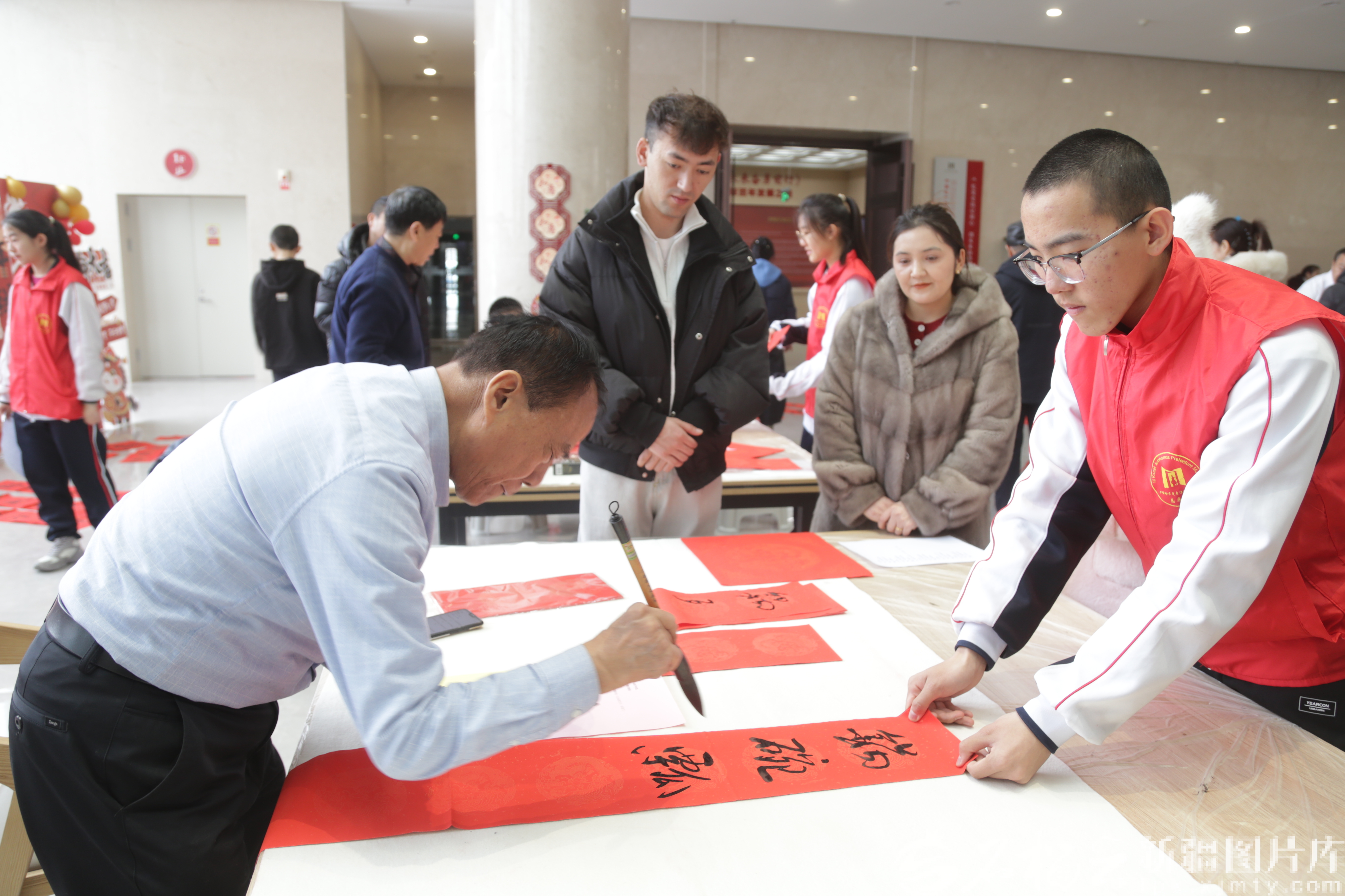中国书法家研究会会员、新疆书法家协会会员范星民在给依热潘・米尔扎提(中)书写春联。天山网-新疆日报记者 宋卫国摄