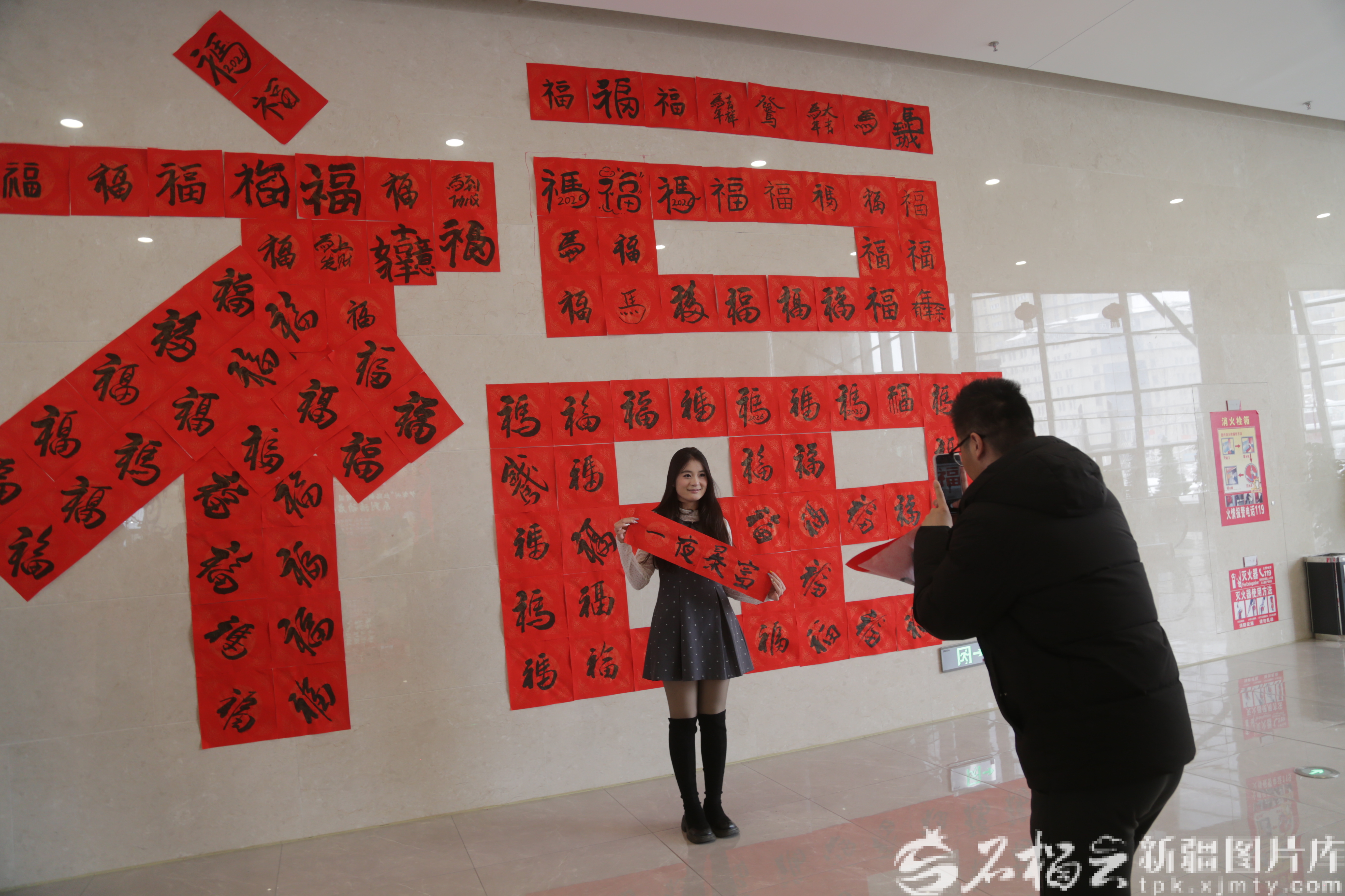 2025年毕业的大学生王路在“百福墙”前拍照打卡。天山网-新疆日报记者 宋卫国摄
