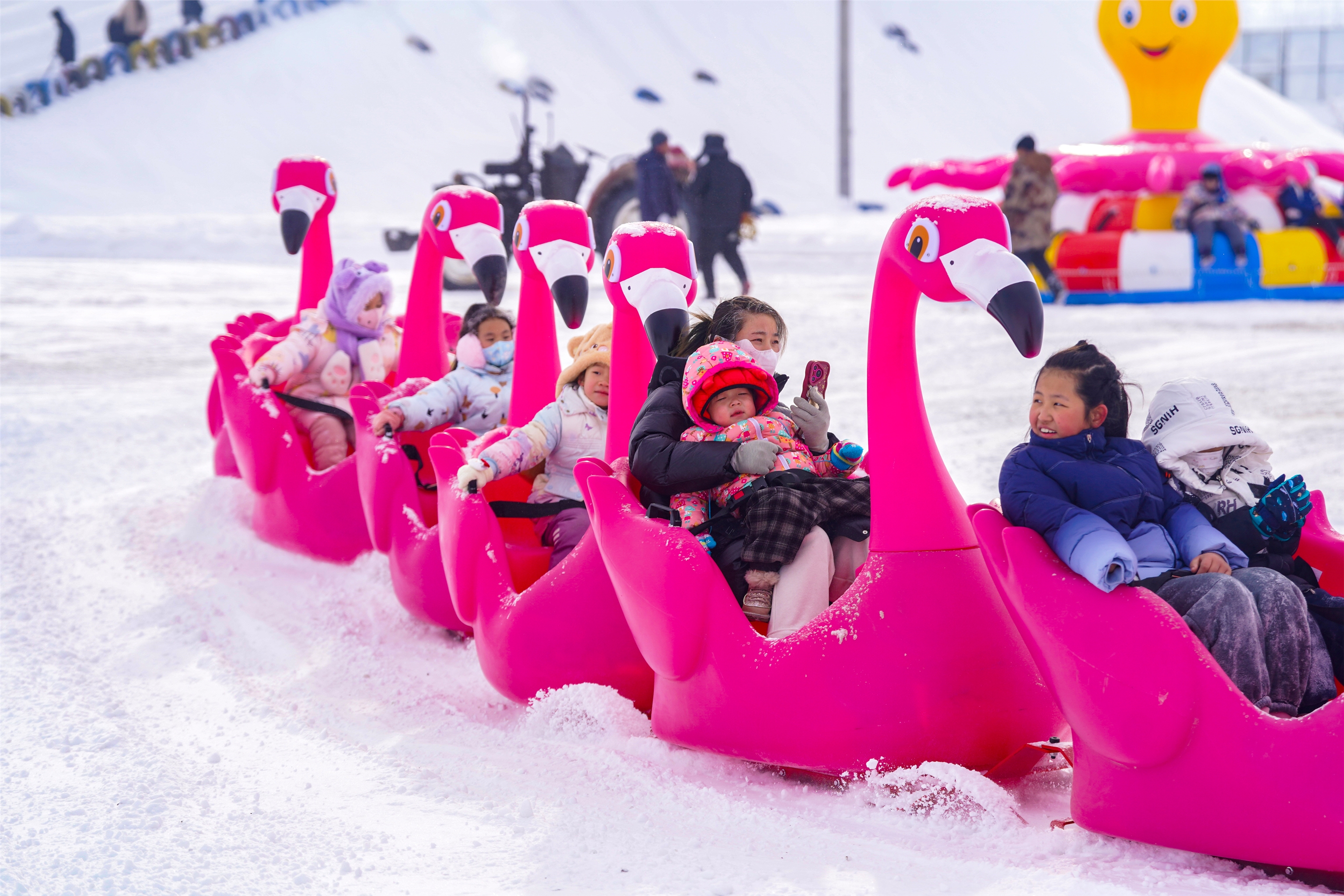 2月8日,在乌苏市田园印象冰雪乐园冰雪场,众多市民和游客纷至沓来,沉浸式体验雪圈、雪地摩托等冰雪运动。李仁锡摄