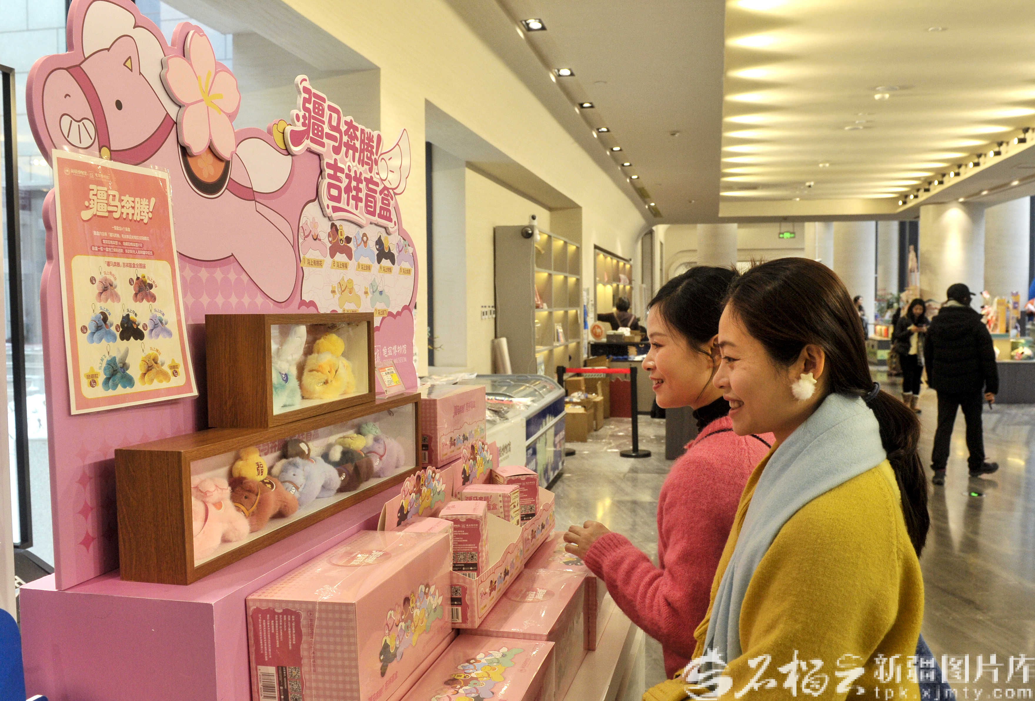 2月13日,游客在新疆博物馆选购以“马”为主题的文创产品。