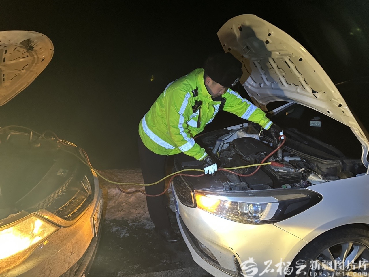 2月11日,富蕴县公安局喀拉通克镇派出所民警为亏电车辆搭电救援。阿勒特乃·努尔木拉提 摄