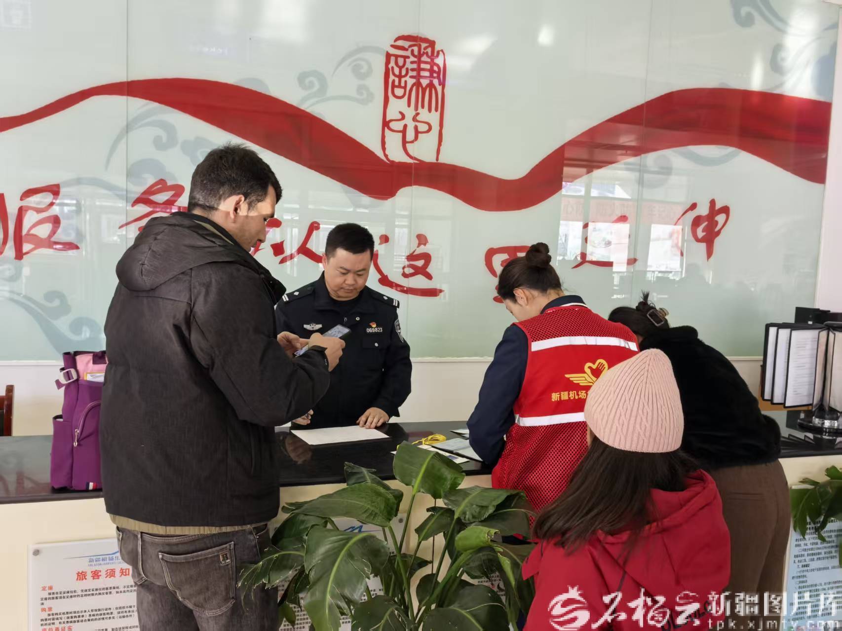 新源县公安局机场派出所民警向旅客开展未成年人安全宣传。谢秦怡 摄