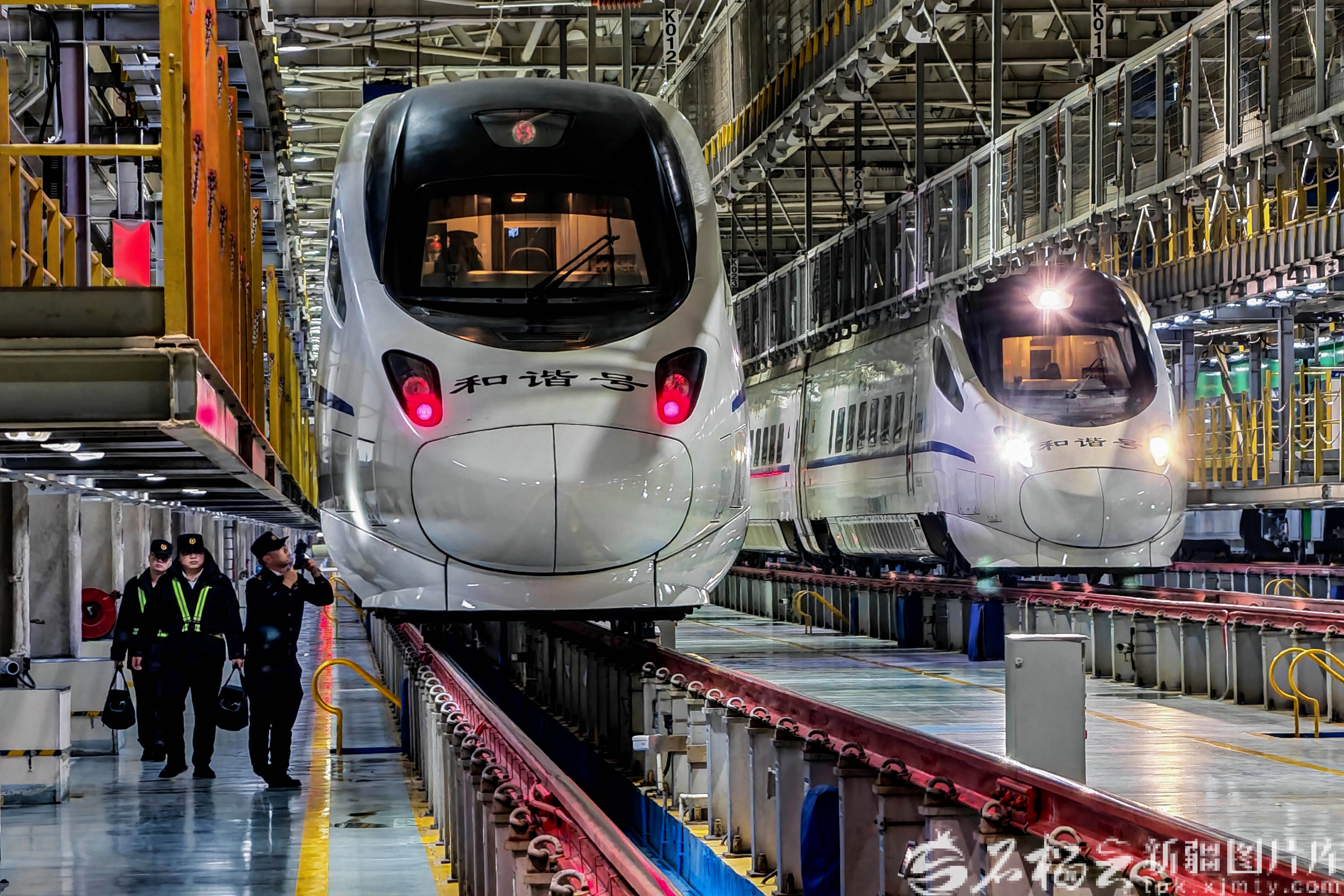 石榴云/新疆日报讯(记者 蔡增乐摄影报道)凌晨3时30分,寒风凛冽,乌鲁木齐车辆段动车检修库内灯火通明,宛如白昼。随车机械师孙春宇已整装上岗,精神饱满地投入到DJ7002次动车组出乘前的最后检查中。“动检车两小时后发车,必须提前把车辆检查到位,确保万无一失。”有着十余年经验的他沉稳说道。