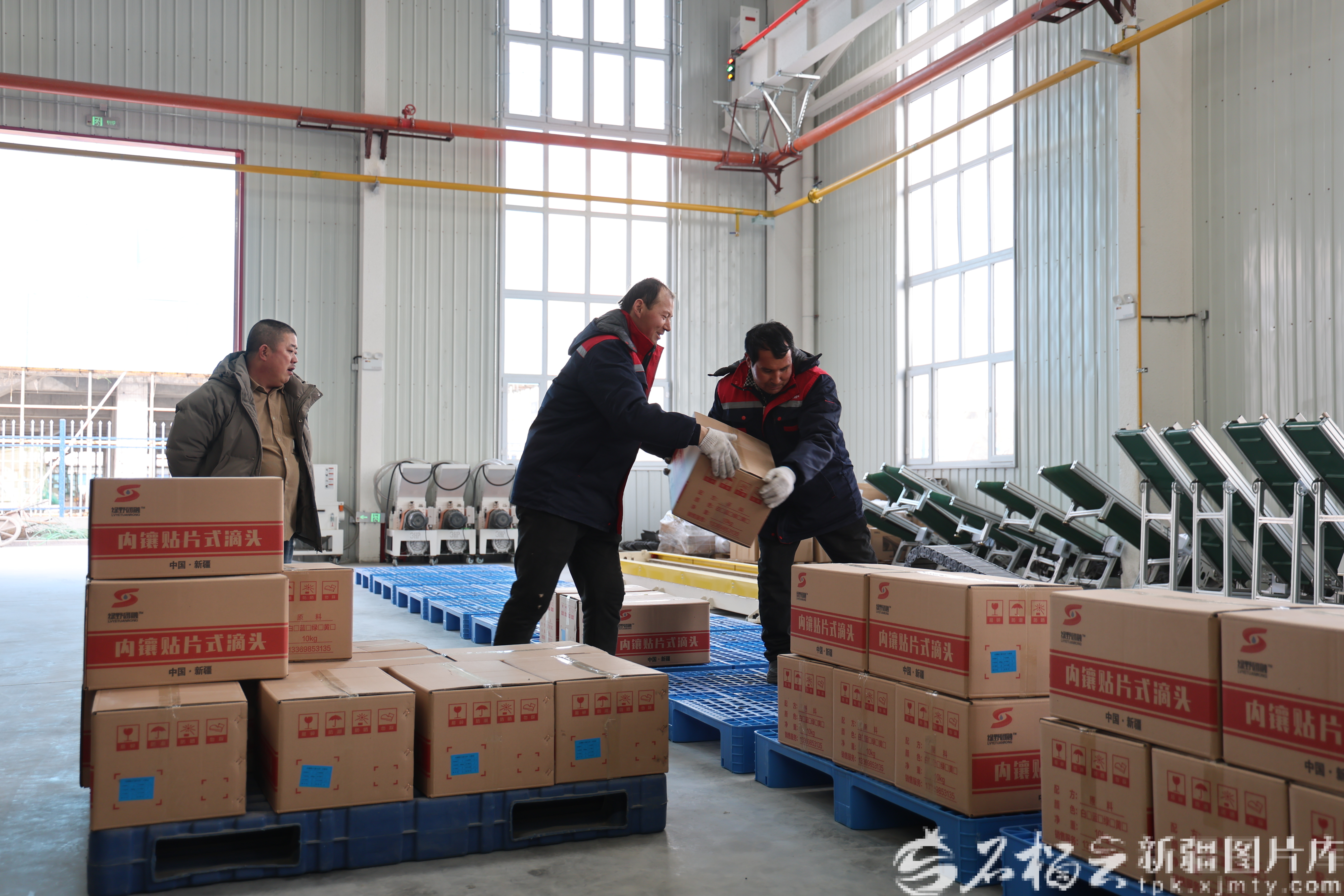 2月23日,新疆瑞辰自动化设备有限公司,工人在搬运内镶贴片式滴头产品。张效红 摄