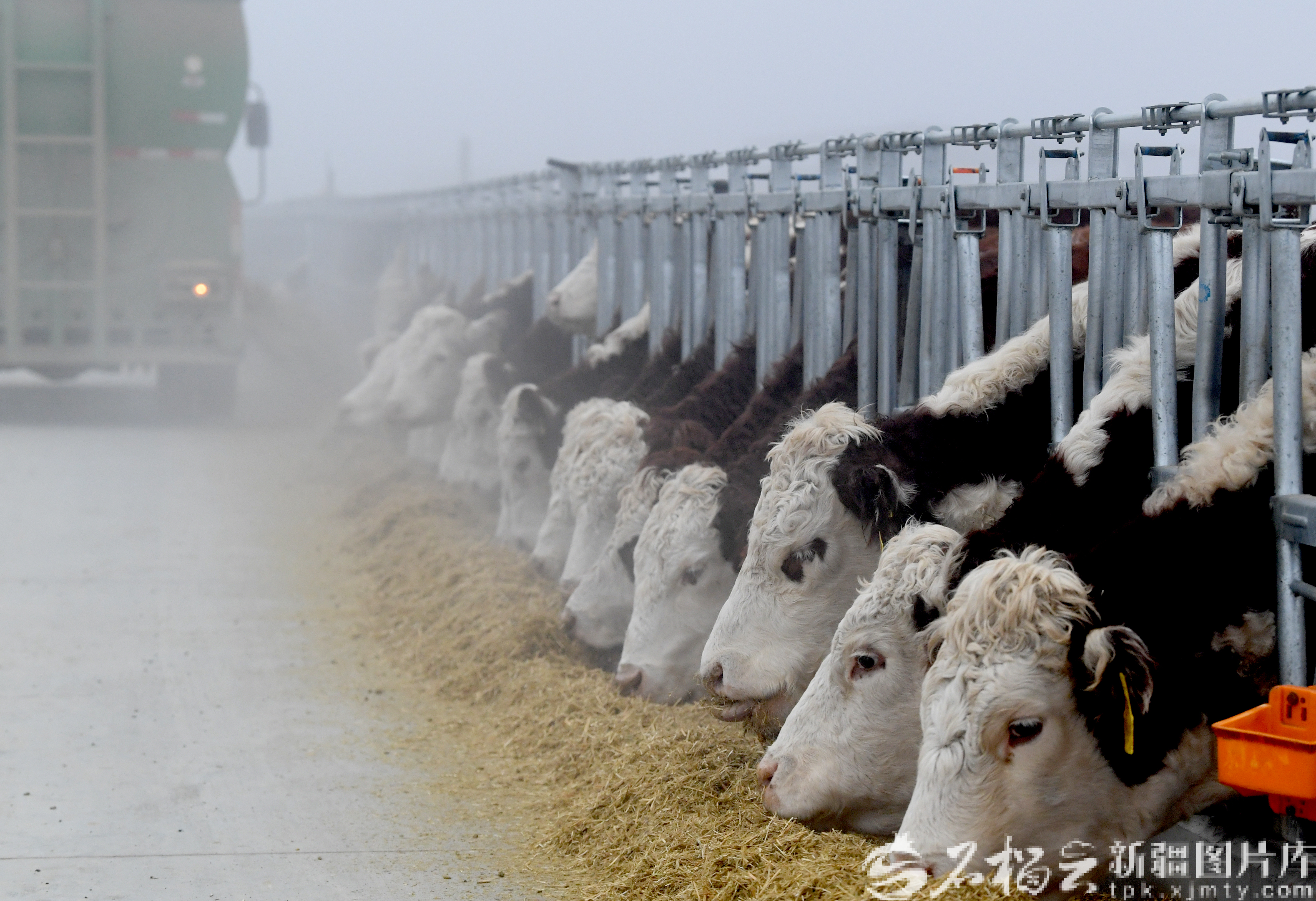 2025年11月28日,新疆隆铭牛业有限公司工作人员驾驶自动投喂车,给肉牛喂食(资料图)。天山网-新疆日报记者 韩亮摄